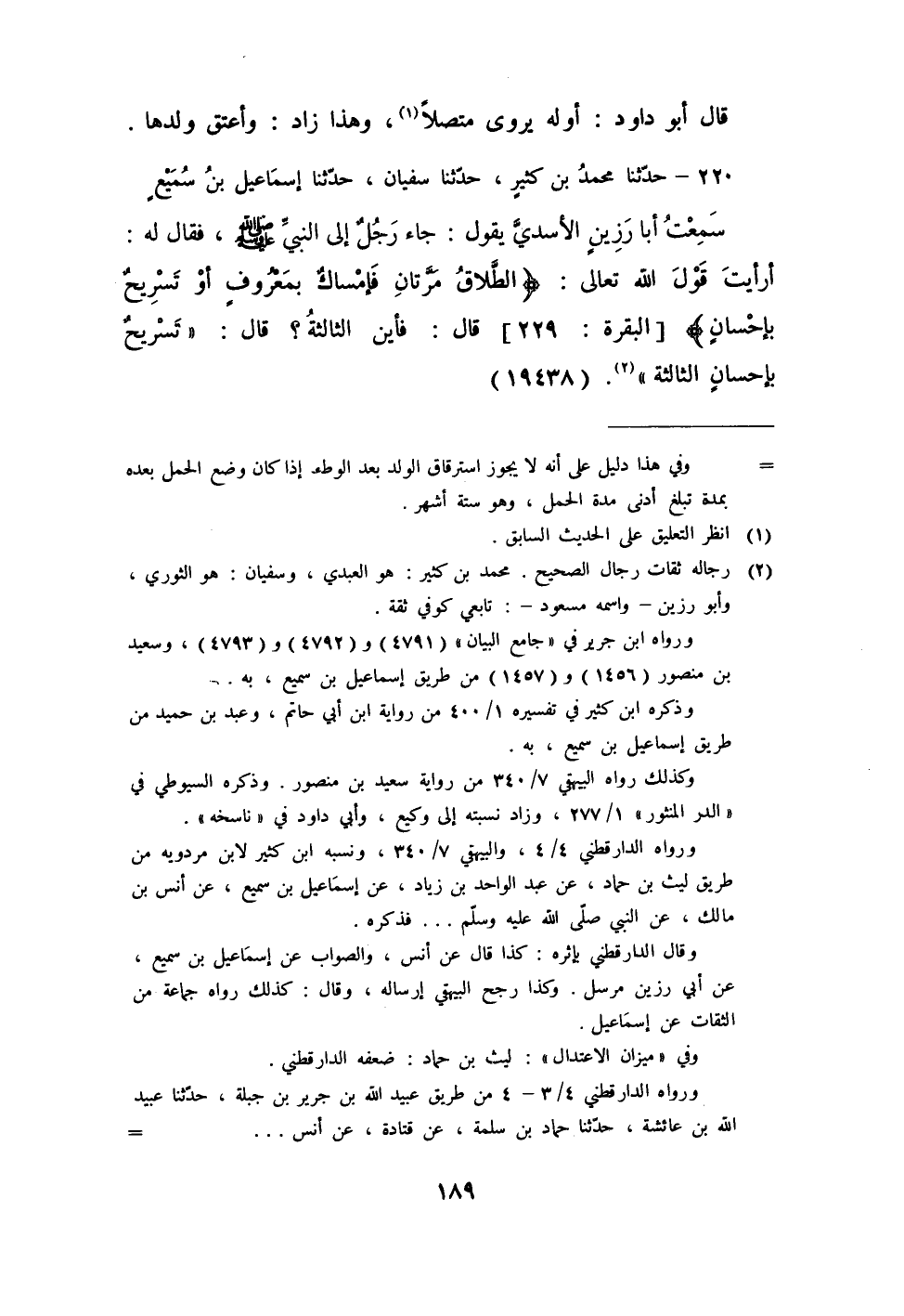 220 - حَدَّثَنَا مُحَمَّدُ بْنُ كَثِيرٍ، حَدَّثَنَا سُفْيَانُ، حَدَّثَنَا إِسْمَاعِيلُ بْنُ سُمَيْعٍ، سَمِعْتُ أَبَا رَزِينٍ الْأَسَدِيَّ، يَقُولُ جَاءَ رَجُلٌ إِلَى النَّبِيِّ صَلَّى اللهُ عَلَيْهِ وَسَلَّمَ فَقَالَ: لَهُ: أَرَأَيْتَ قَوْلَ اللَّهِ تَعَالَى {الطَّلَاقُ مَرَّتَانِ فَإِمْسَاكٌ بِمَعْرُوفٍ أَوْ تَسْرِيحٌ بِإِحْسَانٍ} [البقرة: 229] ، قَالَ: فَأَيْنَ الثَّالِثَةُ؟، قَالَ: «§تَسْرِيحٌ بِإِحْسَانٍ الثَّالِثَةُ»