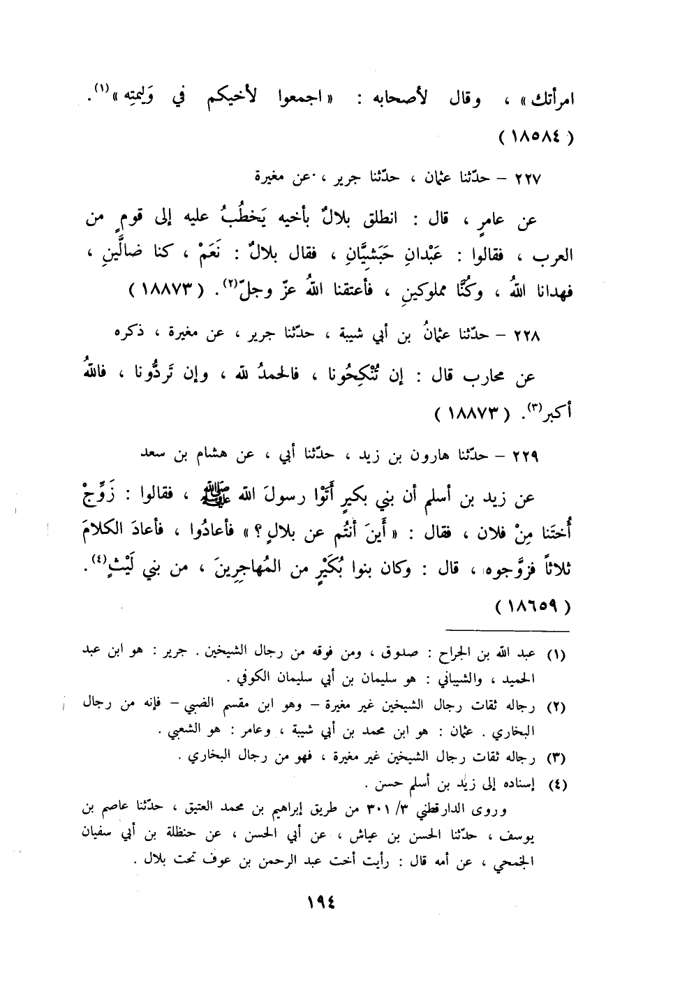 227 - حَدَّثَنَا عُثْمَانُ، حَدَّثَنَا جَرِيرٌ، عَنْ مُغِيرَةَ، عَنْ عَامِرٍ، قَالَ: انْطَلَقَ بِلَالٌ بِأَخِيهِ يَخْطُبُ عَلَيْهِ إِلَى قَوْمٍ مِنَ الْعَرَبِ، فَقَالُوا عَبْدَانِ حَبَشِيَّانِ، فَقَالَ: بِلَالٌ: «نَعَمْ §كُنَّا ضَالَّيْنِ فَهَدَانَا اللَّهُ، وَكُنَّا مَمْلُوكَيْنِ فَأَعْتَقَنَا اللَّهُ عَزَّ وَجَلَّ» .