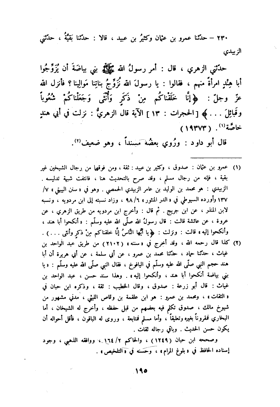 230 - حَدَّثَنَا عَمْرُو بْنُ عُثْمَانَ، وَكَثِيرُ بْنُ عُبَيْدٍ، قَالَا: حَدَّثَنَا بَقِيَّةُ، حَدَّثَنِي الزُّبَيْدِيُّ، حَدَّثَنِي الزُّهْرِيُّ، قَالَ: «§أَمَرَ رَسُولُ اللَّهِ صَلَّى اللهُ عَلَيْهِ وَسَلَّمَ بَنِي بَيَاضَةَ أَنْ يُزَوِّجُوا أَبَا هِنْدٍ امْرَأَةً مِنْهُمْ» ، فَقَالُوا: يَا رَسُولَ اللَّهِ نُزَوِّجُ بَنَاتِنَا مَوَالِينَا؟، فَأَنْزَلَ اللَّهُ عَزَّ وَجَلَّ {إِنَّا خَلَقْنَاكُمْ مِنْ ذَكَرٍ وَأُنْثَى وَجَعَلْنَاكُمْ شُعُوبًا وَقَبَائِلَ} [الحجرات: 13] الْآيَةَ قَالَ: الزُّهْرِيُّ: نَزَلَتْ فِي أَبِي هِنْدٍ خَاصَّةً قَالَ أَبُو دَاوُدَ: وَرُوِيَ بَعْضُهُ مُسْنَدًا وَهُوَ ضَعِيفٌ