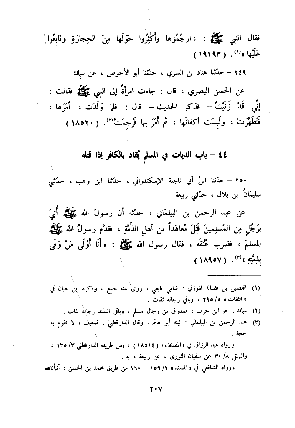 250 - حَدَّثَنَا ابْنُ أَبِي نَاجِيَةَ الْإِسْكَنْدَرَانِيُّ، حَدَّثَنَا ابْنُ وَهْبٍ، حَدَّثَنِي سُلَيْمَانُ بْنُ بِلَالٍ، حَدَّثَنِي رَبِيعَةُ، عَنْ عَبْدِ الرَّحْمَنِ بْنِ الْبَيْلَمَانِيِّ، حَدَّثَهُ أَنَّ رَسُولَ اللَّهِ صَلَّى اللهُ عَلَيْهِ وَسَلَّمَ أُتِيَ بِرَجُلٍ مِنَ الْمُسْلِمِينَ قَتَلَ مُعَاهَدًا مِنْ أَهْلِ الذِّمَّةِ، فَقَدَّمَ رَسُولُ اللَّهِ صَلَّى اللهُ عَلَيْهِ وَسَلَّمَ الْمُسْلِمَ فَضَرَبَ عُنُقَهُ فَقَالَ رَسُولُ اللَّهِ صَلَّى اللهُ عَلَيْهِ وَسَلَّمَ: «§أَنَا أَوْلَى مَنْ وَفَى بِذِمَّتِهِ» -[208]- قَالَ: ابْنُ وَهْبٍ: تَفْسِيرُهُ أَنَّهُ قَتَلَهُ غِيلَةً