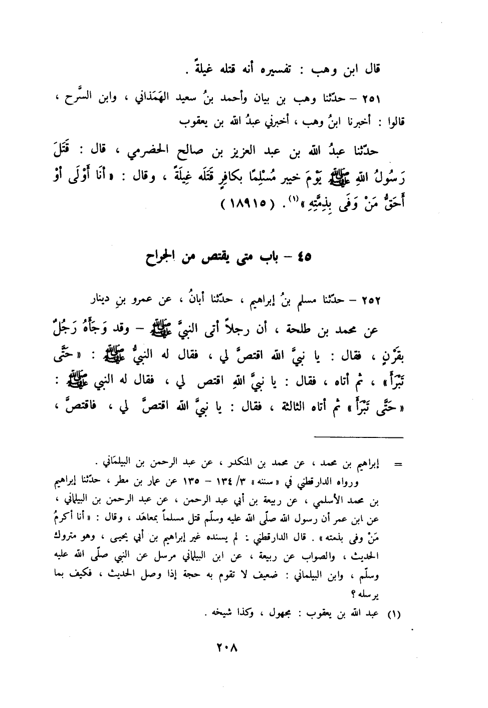 251 - حَدَّثَنَا وَهْبُ بْنُ بَيَانٍ، وَأَحْمَدُ بْنُ سَعِيدٍ الْهَمَذَانِيُّ، وَابْنُ السَّرْحِ، قَالُوا: أَخْبَرَنَا ابْنُ وَهْبٍ، أَخْبَرَنِي عَبْدُ اللَّهِ بْنُ يَعْقُوبٍ، حَدَّثَنَا عَبْدُ اللَّهِ بْنُ عَبْدِ الْعَزِيزِ بْنِ صَالِحِ الْحَضْرَمِيُّ، قَالَ: قَتَلَ رَسُولُ اللَّهِ صَلَّى اللهُ عَلَيْهِ وَسَلَّمَ يَوْمَ خَيْبَرَ مُسْلِمًا بِكَافِرٍ قَتَلَهُ غِيلَةً، وَقَالَ: «§أَنَا أَوْلَى أَوْ أَحَقُّ مَنْ وَفَى بِذِمَّتِهِ»