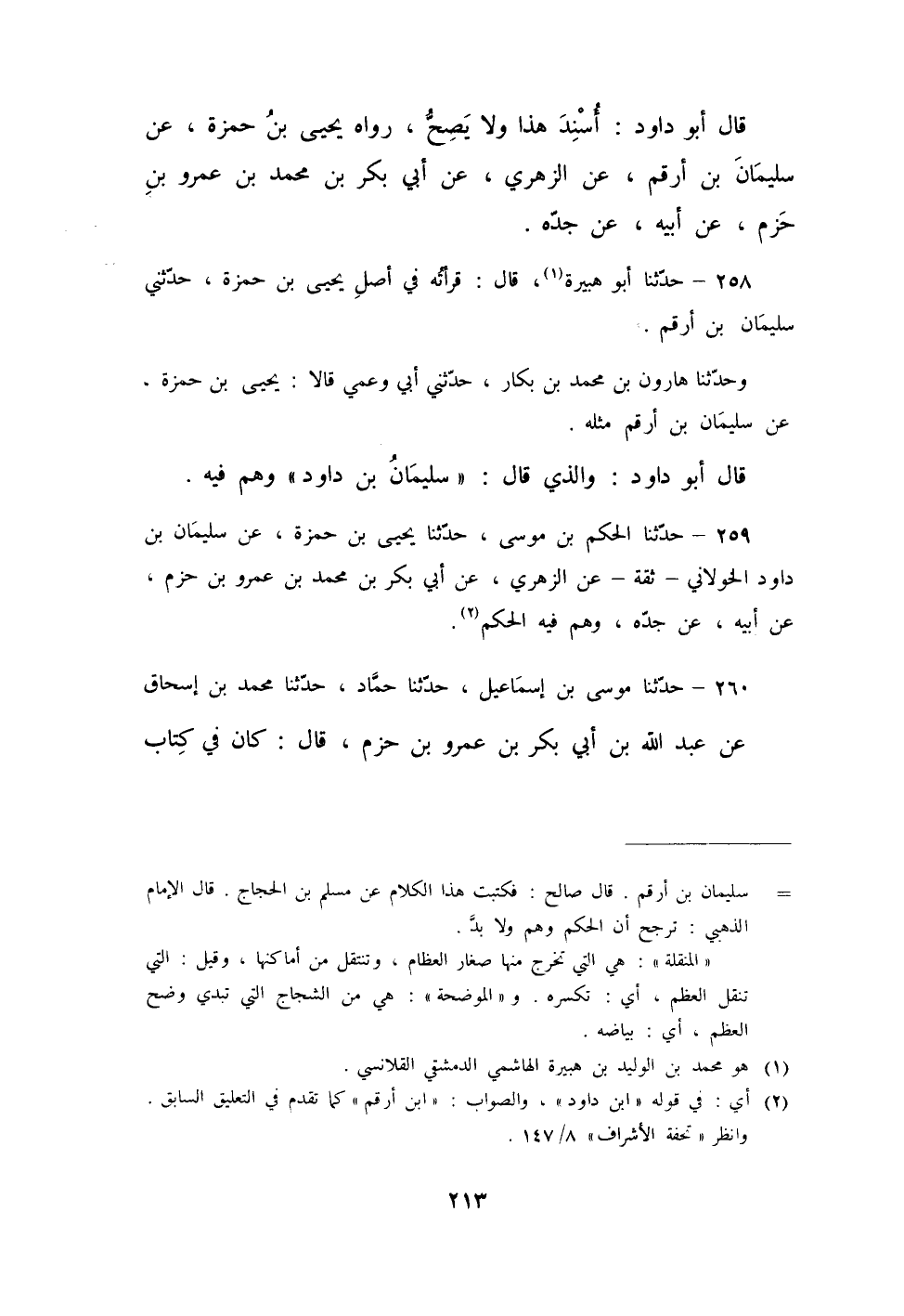 260 - حَدَّثَنَا مُوسَى بْنُ إِسْمَاعِيلَ، حَدَّثَنَا حَمَّادٌ، حَدَّثَنَا مُحَمَّدُ بْنُ إِسْحَاقَ، عَنْ عَبْدِ اللَّهِ بْنِ أَبِي بَكْرِ بْنِ عَمْرِو بْنِ حَزْمٍ، قَالَ: كَانَ فِي كِتَابِ -[214]- رَسُولِ اللَّهِ صَلَّى اللهُ عَلَيْهِ وَسَلَّمَ، - يَعْنِي هَذَا - «§وَفِي الذَّكَرِ الدِّيَةُ، وَفِي اللِّسَانِ الدِّيَةُ»