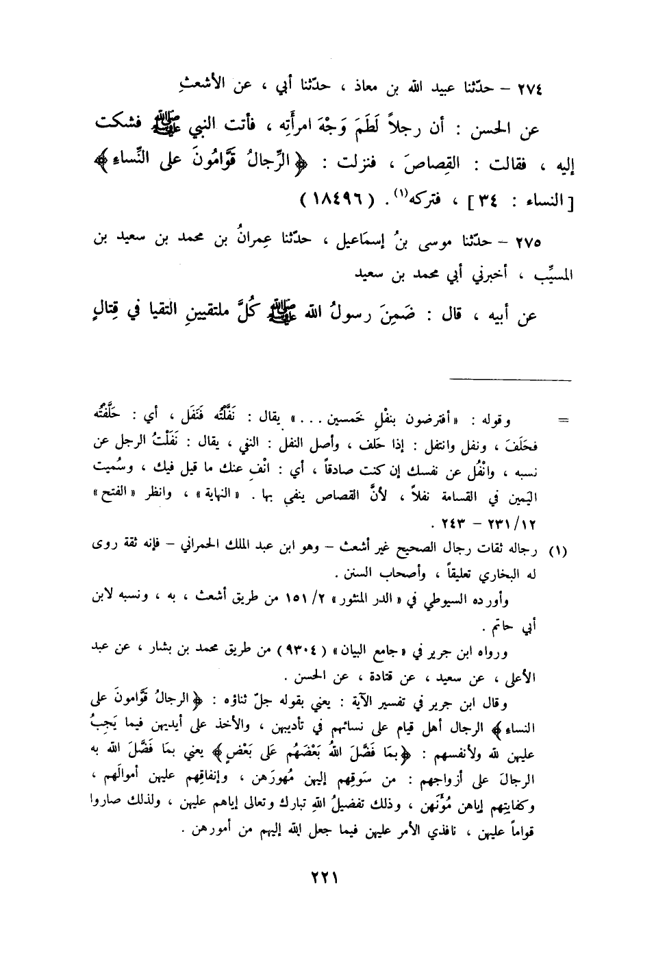 274 - حَدَّثَنَا عُبَيْدُ اللَّهِ بْنُ مُعَاذٍ، حَدَّثَنَا أَبِي، عَنِ الْأَشْعَثِ، عَنِ الْحَسَنِ، " أَنَّ رَجُلًا لَطَمَ وَجْهَ امْرَأَتِهِ §فَأَتَتِ النَّبِيَّ صَلَّى اللهُ عَلَيْهِ وَسَلَّمَ، فَشَكَتْ إِلَيْهِ فَقَالَتْ: الْقِصَاصُ، فَنَزَلَتِ {الرِّجَالُ قَوَّامُونَ عَلَى النِّسَاءِ} [النساء: 34] فَتَرَكَهُ "