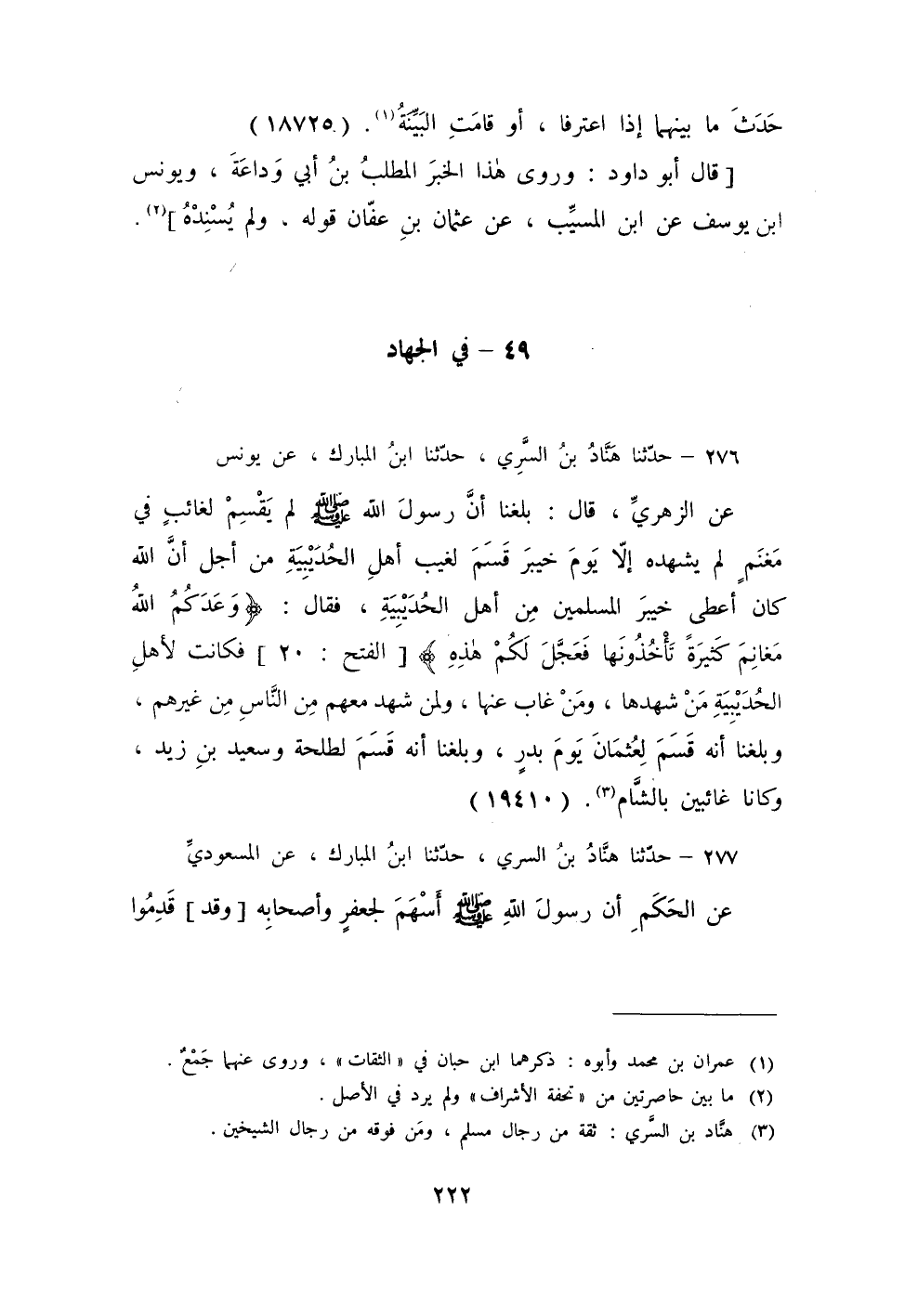 276 - حَدَّثَنَا هَنَّادُ بْنُ السَّرِيِّ، حَدَّثَنَا ابْنُ الْمُبَارَكِ، عَنْ يُونُسَ، عَنْ الزُّهْرِيِّ، قَالَ: بَلَغَنَا أَنَّ رَسُولَ اللَّهِ صَلَّى اللهُ عَلَيْهِ وَسَلَّمَ " §لَمْ يَقْسِمْ لِغَائِبٍ فِي مَغْنَمٍ لَمْ يَشْهَدْهُ إِلَّا يَوْمَ خَيْبَرَ، قَسَمَ لِغُيَّبِ أَهْلِ الْحُدَيْبِيَةِ مِنْ أَجْلِ أَنَّ اللَّهَ كَانَ أَعْطَى خَيْبَرَ الْمُسْلِمِينَ مِنْ أَهْلِ الْحُدَيْبِيَةِ، فَقَالَ: {وَعَدَكُمُ اللَّهُ مَغَانِمَ كَثِيرَةً تَأْخُذُونَهَا فَعَجَّلَ لَكُمْ هَذِهِ} [الفتح: 20] ، فَكَانَتْ لِأَهْلِ الْحُدَيْبِيَةِ؛ مَنْ شَهِدَهَا وَمَنْ غَابَ عَنْهَا، وَلِمَنْ شَهِدَ مَعَهُمْ مِنَ النَّاسِ مِنْ غَيْرِهِمْ وَبَلَغَنَا أَنَّهُ قَسَمَ لِعُثْمَانَ يَوْمَ بَدْرٍ، وَبَلَغَنَا أَنَّهُ قَسَمَ لِطَلْحَةَ وَسَعِيدِ بْنِ زَيْدٍ وَكَانَا غَائِبَيْنِ بِالشَّامِ "