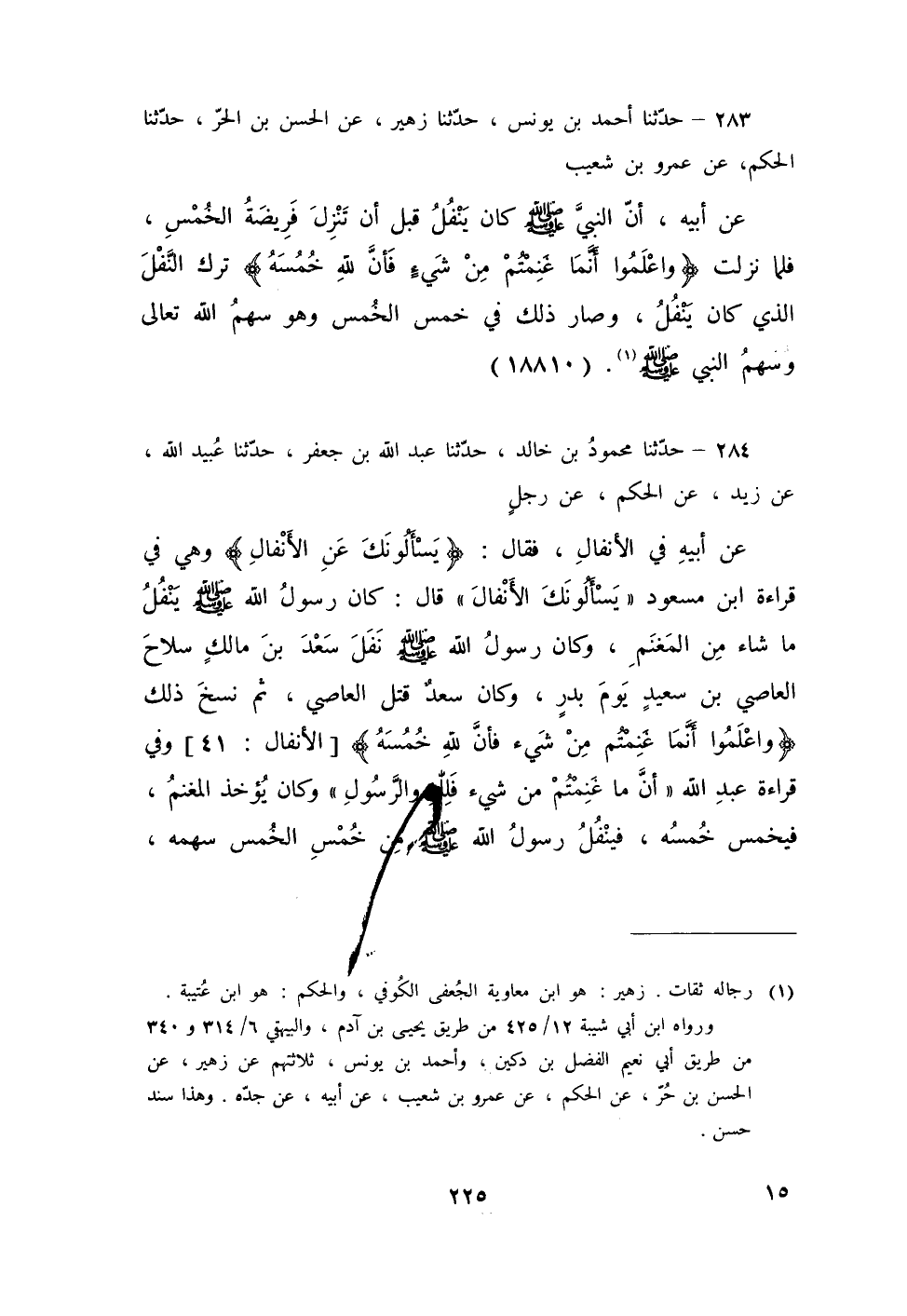 283 - حَدَّثَنَا أَحْمَدُ بْنُ يُونُسَ، حَدَّثَنَا زُهَيْرٌ، عَنِ الْحَسَنِ بْنِ الْحُرِّ، حَدَّثَنَا الْحَكَمُ، عَنْ عَمْرِو بْنِ شُعَيْبٍ، عَنْ أَبِيهِ، أَنَّ النَّبِيَّ صَلَّى اللهُ عَلَيْهِ وَسَلَّمَ " §كَانَ يَنْفُلُ قَبْلَ أَنْ تَنْزِلَ فَرِيضَةُ الْخُمْسِ، فَلَمَّا نَزَلَتْ {وَاعْلَمُوا أَنَّمَا غَنِمْتُمْ مِنْ شَيْءٍ فَأَنَّ لِلَّهِ خُمُسَهُ} [الأنفال: 41] تَرَكَ النَّفَلَ الَّذِي كَانَ يَنْفُلُ وَصَارَ ذَلِكَ فِي خُمْسِ الْخُمْسِ وَهُوَ سَهْمُ اللَّهِ تَعَالَى وَسَهْمُ النَّبِيِّ صَلَّى اللهُ عَلَيْهِ وَسَلَّمَ "