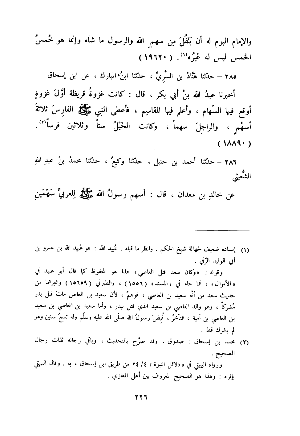 286 - حَدَّثَنَا أَحْمَدُ بْنُ حَنْبَلٍ، حَدَّثَنَا وَكِيعٌ، حَدَّثَنَا مُحَمَّدُ بْنُ عَبْدِ اللَّهِ الشُّعَيْثِيُّ، عَنْ خَالِدِ بْنِ مَعْدَانَ، قَالَ: «§أَسْهَمَ رَسُولُ اللَّهِ صَلَّى اللهُ عَلَيْهِ وَسَلَّمَ لِلْعَرَبِيِّ سَهْمَيْنِ -[227]- وَلِلْهَجِينِ سَهْمًا»