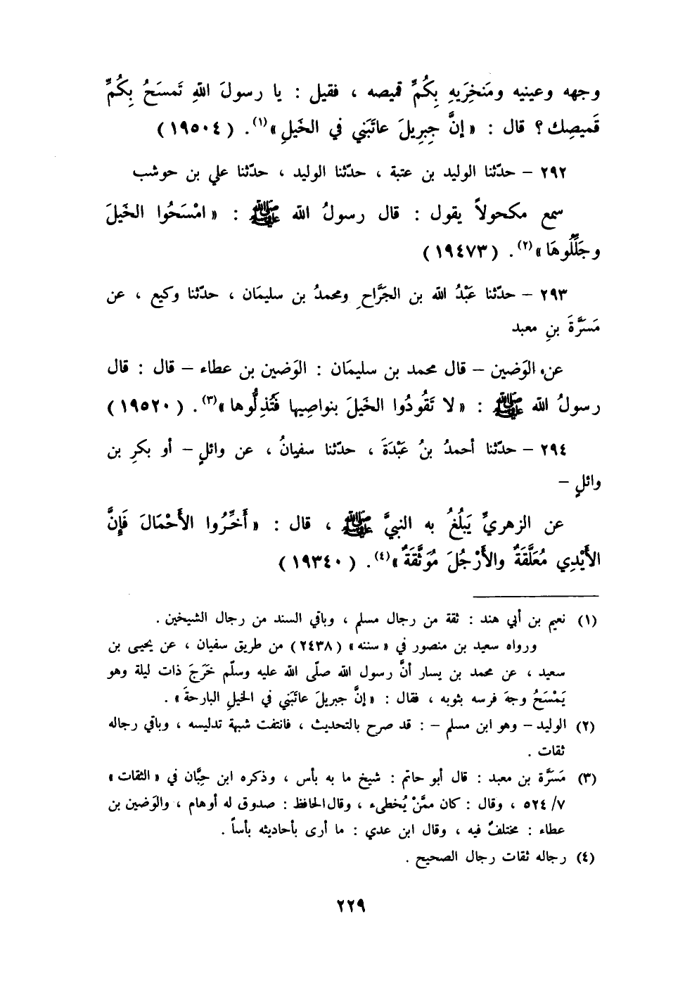 293 - حَدَّثَنَا عَبْدُ اللَّهِ بْنُ الْجَرَّاحِ، وَمُحَمَّدُ بْنُ سُلَيْمَانَ، حَدَّثَنَا وَكِيعٌ، عَنْ مَسَرَّةَ بْنِ مَعْبَدٍ، عَنِ الْوَضِينِ، قَالَ: مُحَمَّدُ بْنُ سُلَيْمَانَ: الْوَضِينُ بْنُ عَطَاءٍ، قَالَ: قَالَ رَسُولُ اللَّهِ صَلَّى اللهُ عَلَيْهِ وَسَلَّمَ: «§لَا تَقُودُوا الْخَيْلَ بِنَوَاصِيهَا فَتُذِلُّوهَا»