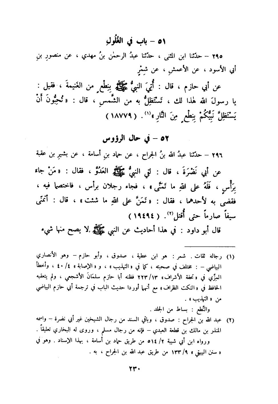296 - حَدَّثَنَا عَبْدُ اللَّهِ بْنُ الْجَرَّاحِ، عَنْ حَمَّادِ بْنِ أُسَامَةَ، عَنْ بَشِيرِ بْنِ عُقْبَةَ، عَنْ أَبِي نَضْرَةَ، قَالَ: لَقِيَ النَّبِيُّ صَلَّى اللهُ عَلَيْهِ وَسَلَّمَ الْعَدُوَّ فَقَالَ: «§مَنْ جَاءَ بِرَأْسٍ فَلَهُ عَلَى اللَّهِ مَا تَمَنَّى» ، فَجَاءَ رَجُلَانِ بِرَأْسٍ فَاخْتَصَمَا فِيهِ فَقَضَى بِهِ لِأَحَدِهِمَا، فَقَالَ: «تَمَنَّ عَلَى اللَّهِ مَا شِئْتَ» ، قَالَ: أَتَمَنَّى سَيْفًا صَارِمًا حَتَّى أُقْتَلَ قَالَ أَبُو دَاوُدَ: فِي هَذَا أَحَادِيثُ عَنِ النَّبِيِّ صَلَّى اللهُ عَلَيْهِ وَسَلَّمَ لَا يَصِحُّ مِنْهَا شَيْءٌ