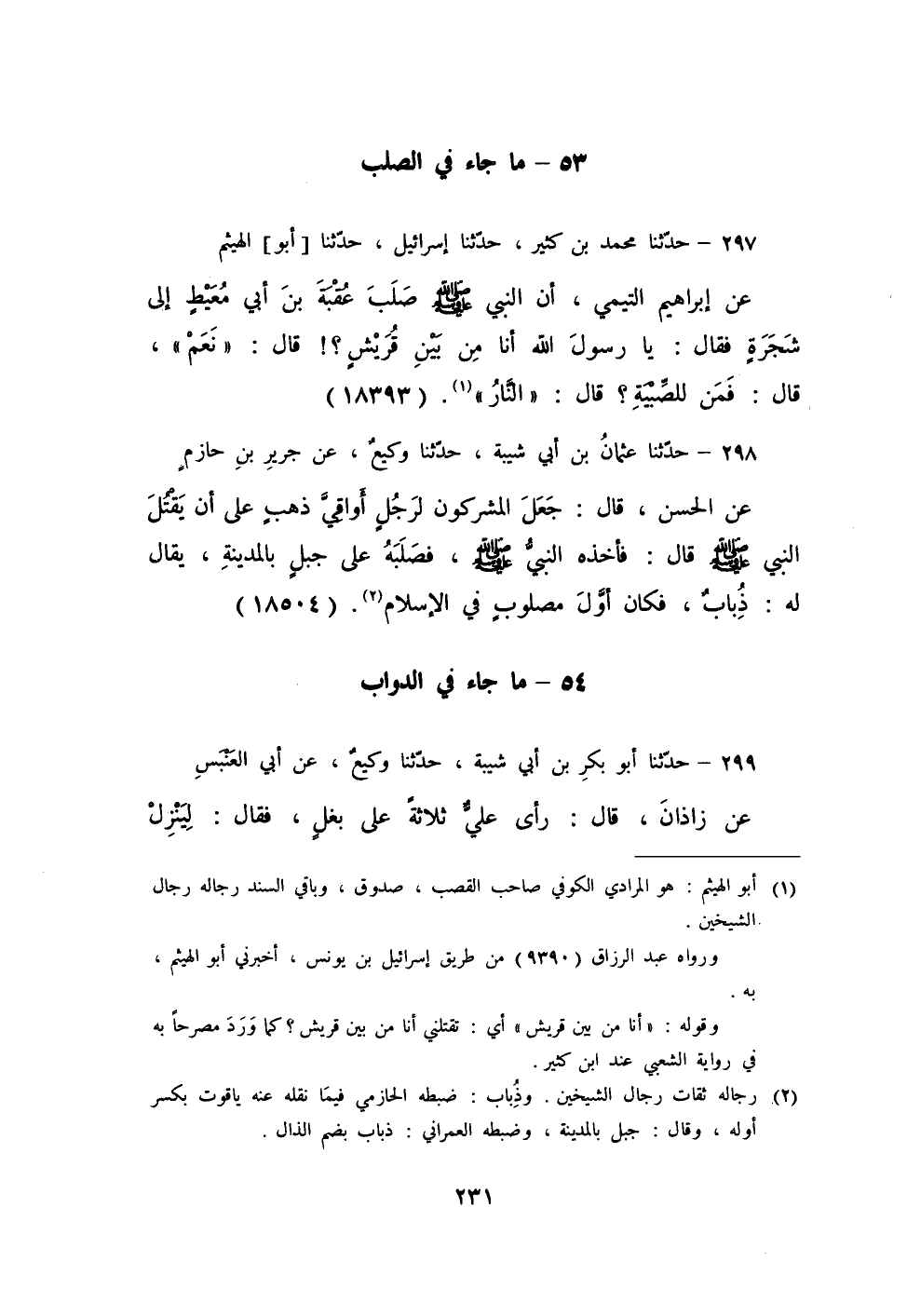 297 - حَدَّثَنَا مُحَمَّدُ بْنُ كَثِيرٍ، حَدَّثَنَا إِسْرَائِيلُ، حَدَّثَنَا أَبُو الْهَيْثَمِ، عَنْ إِبْرَاهِيمَ التَّيْمِيِّ، أَنَّ النَّبِيَّ صَلَّى اللهُ عَلَيْهِ وَسَلَّمَ §صَلَبَ عُقْبَةَ بْنَ أَبِي مُعَيْطٍ إِلَى شَجَرَةٍ، فَقَالَ: يَا رَسُولَ اللَّهِ أَنَا مِنْ بَيْنِ قُرَيْشٍ؟، قَالَ: «نَعَمْ» ، قَالَ: فَمَنْ لِلصِّبْيَةِ، قَالَ: «النَّارُ»