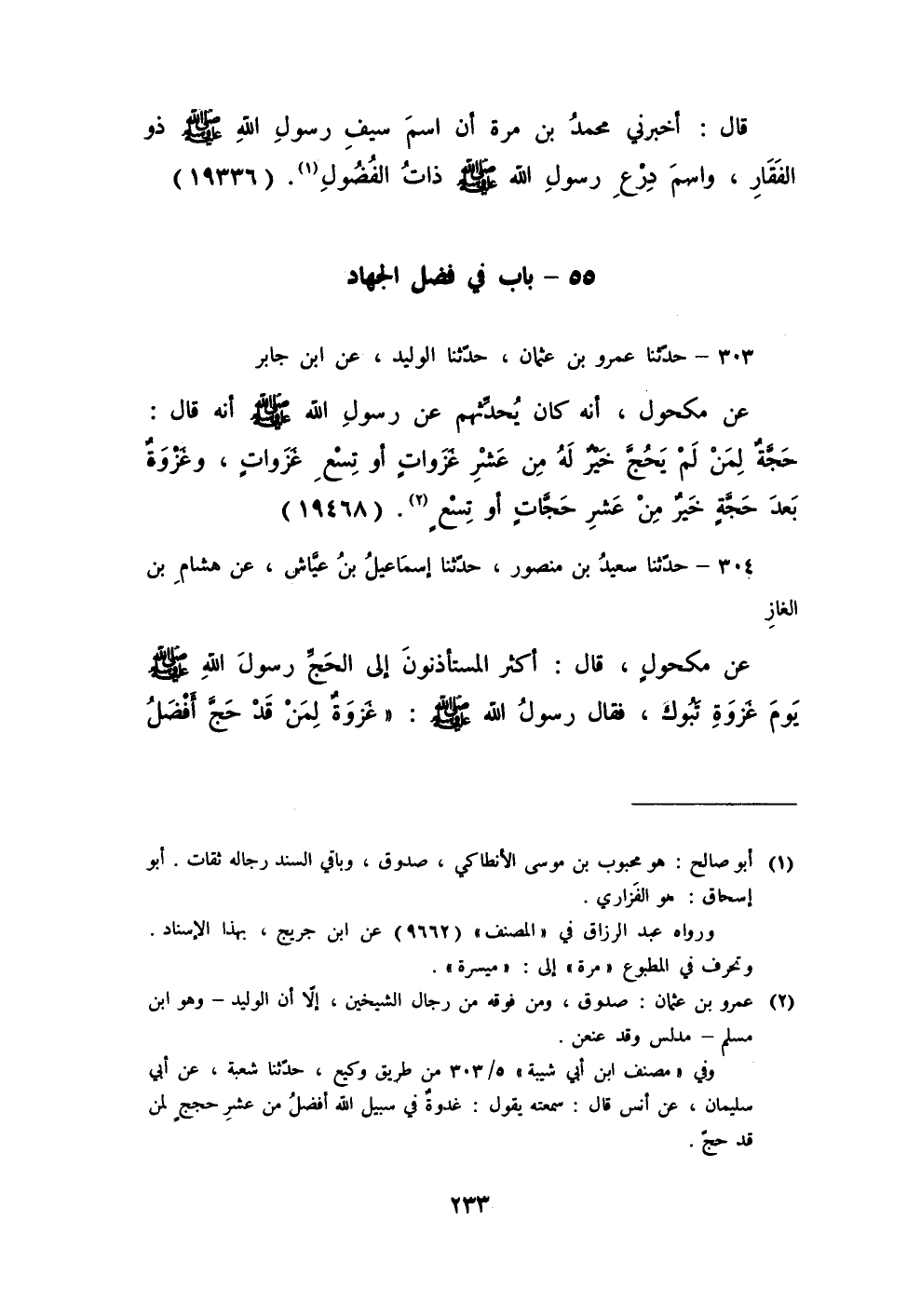 304 - حَدَّثَنَا سَعِيدُ بْنُ مَنْصُورٍ، حَدَّثَنَا إِسْمَاعِيلُ بْنُ عَيَّاشٍ، عَنْ هِشَامِ بْنِ الْغَازِ، عَنْ مَكْحُولٍ، قَالَ: أَكْثَرَ الْمُسْتَأْذِنُونُ إِلَى الْحَجِّ رَسُولَ اللَّهِ صَلَّى اللهُ عَلَيْهِ وَسَلَّمَ يَوْمَ غَزْوَةِ تَبُوكَ، فَقَالَ رَسُولُ اللَّهِ صَلَّى اللهُ عَلَيْهِ وَسَلَّمَ: «§غَزْوَةٌ لِمَنْ قَدْ حَجَّ أَفْضَلُ -[234]- مِنْ أَرْبَعِينَ حَجَّةً»
