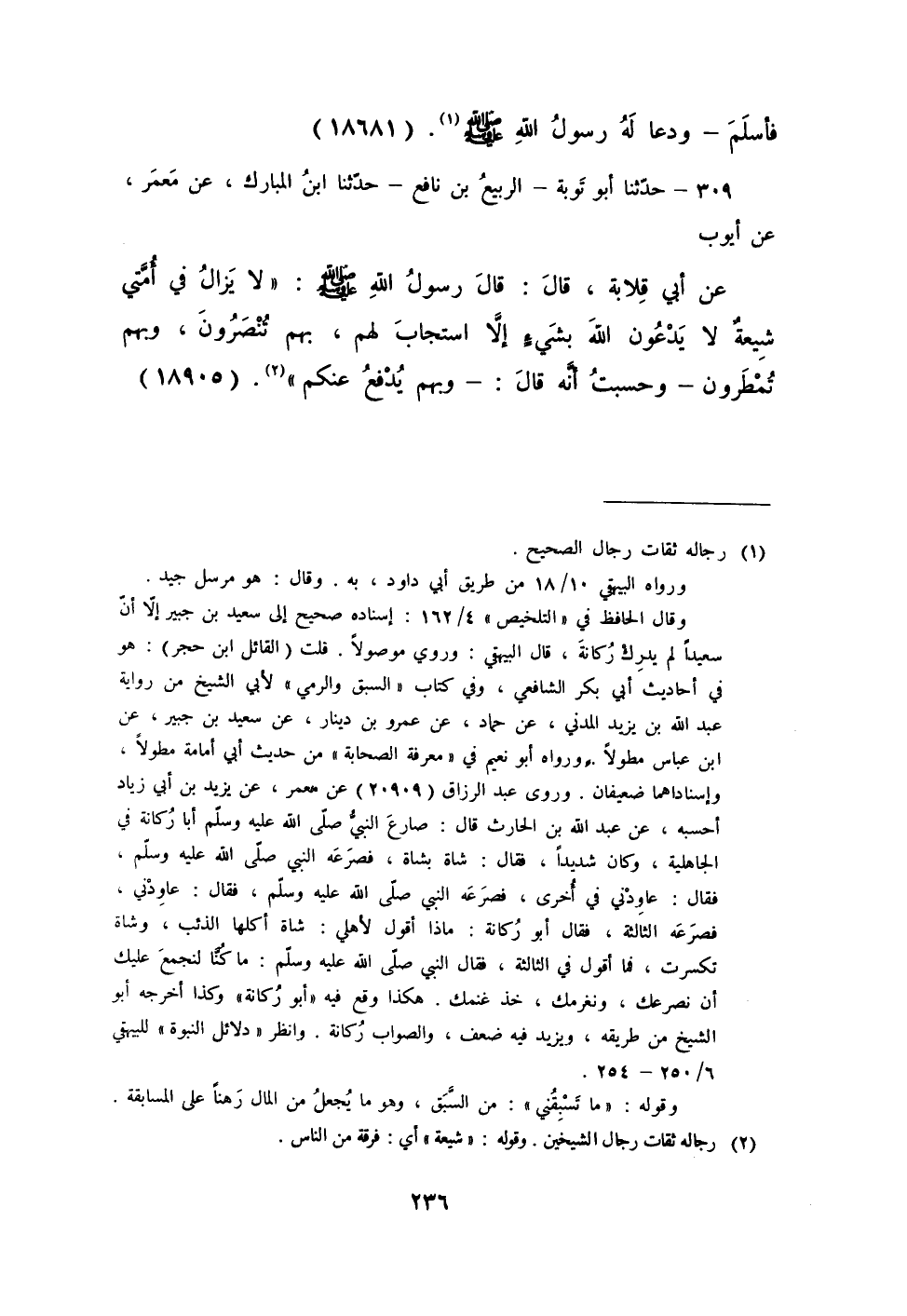 309 - حَدَّثَنَا أَبُو تَوْبَةَ الرَّبِيعُ بْنُ نَافِعٍ، حَدَّثَنَا ابْنُ الْمُبَارَكِ، عَنْ مَعْمَرٍ، عَنْ أَيُّوبَ، عَنْ أَبِي قِلَابَةَ، قَالَ: قَالَ رَسُولُ اللَّهِ صَلَّى اللهُ عَلَيْهِ وَسَلَّمَ: «§لَا يَزَالُ فِي أُمَّتِي شِيعَةٌ، لَا يَدْعُونَ اللَّهَ بِشَيْءٍ إِلَّا اسْتَجَابَ لَهُمْ، بِهِمْ تُنْصَرُونَ وَبِهِمْ تُمْطَرُونَ» ، وَحَسِبْتُ أَنَّهُ قَالَ: «وَبِهِمْ يُدْفَعُ عَنْكُمْ»