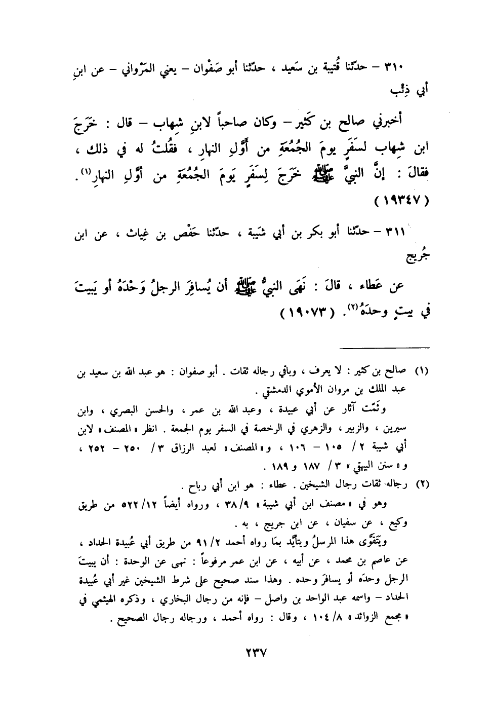 310 - حَدَّثَنَا قُتَيْبَةُ بْنُ سَعِيدٍ، حَدَّثَنَا أَبُو صَفْوَانَ يَعْنِي الْمَرْوَانِيَّ، عَنِ ابْنِ أَبِي ذِئْبٍ، أَخْبَرَنِي صَالِحُ بْنُ كَثِيرٍ، - وَكَانَ، صَاحِبًا لِابْنِ شِهَابٍ، قَالَ: خَرَجَ ابْنُ شِهَابٍ لِسَفَرٍ يَوْمَ الْجُمُعَةِ مِنْ أَوَّلِ النَّهَارِ، فَقُلْتُ لَهُ فِي ذَلِكَ، فَقَالَ: إِنَّ النَّبِيَّ صَلَّى اللهُ عَلَيْهِ وَسَلَّمَ «§خَرَجَ لِسَفَرٍ يَوْمَ الْجُمُعَةِ مِنْ أَوَّلِ النَّهَارِ»