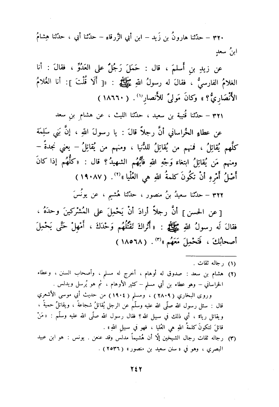 320 - حَدَّثَنَا هَارُونُ بْنُ زَيْدِ بْنِ أَبِي الزَّرْقَاءِ، حَدَّثَنَا أَبِي، حَدَّثَنَا هِشَامُ بْنُ سَعْدٍ، عَنْ زَيْدِ بْنِ أَسْلَمَ، قَالَ: حَمَلَ رَجُلٌ عَلَى الْعَدُوِّ فَقَالَ: أَنَا الْغُلَامُ الْفَارِسِيُّ، فَقَالَ: لَهُ رَسُولُ اللَّهِ صَلَّى اللهُ عَلَيْهِ وَسَلَّمَ: " §أَلَا قُلْتَ: أَنَا الْغُلَامُ الْأَنْصَارِيُّ " وَكَانَ مَوْلًى لِلْأَنْصَارِ