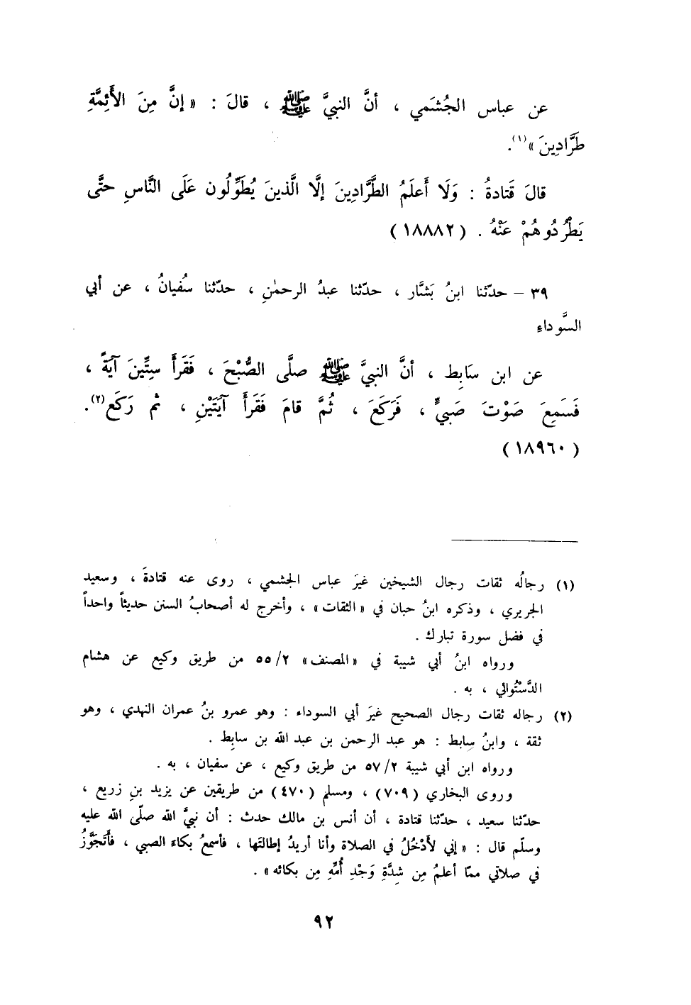 39 - حَدَّثَنَا ابْنُ بَشَّارٍ، حَدَّثَنَا عَبْدُ الرَّحْمَنِ، حَدَّثَنَا سُفْيَانُ، عَنْ أَبِي السَّوْدَاءِ، عَنِ ابْنِ سَابِطٍ، أَنَّ النَّبِيَّ صَلَّى اللهُ عَلَيْهِ وَسَلَّمَ §صَلَّى الصُّبْحَ، فَقَرَأَ سِتِّينَ آيَةً، فَسَمِعَ صَوْتَ صَبِيٍّ، فَرَكَعَ، ثُمَّ قَامَ فَقَرَأَ آيَتَيْنِ، ثُمَّ رَكَعَ "