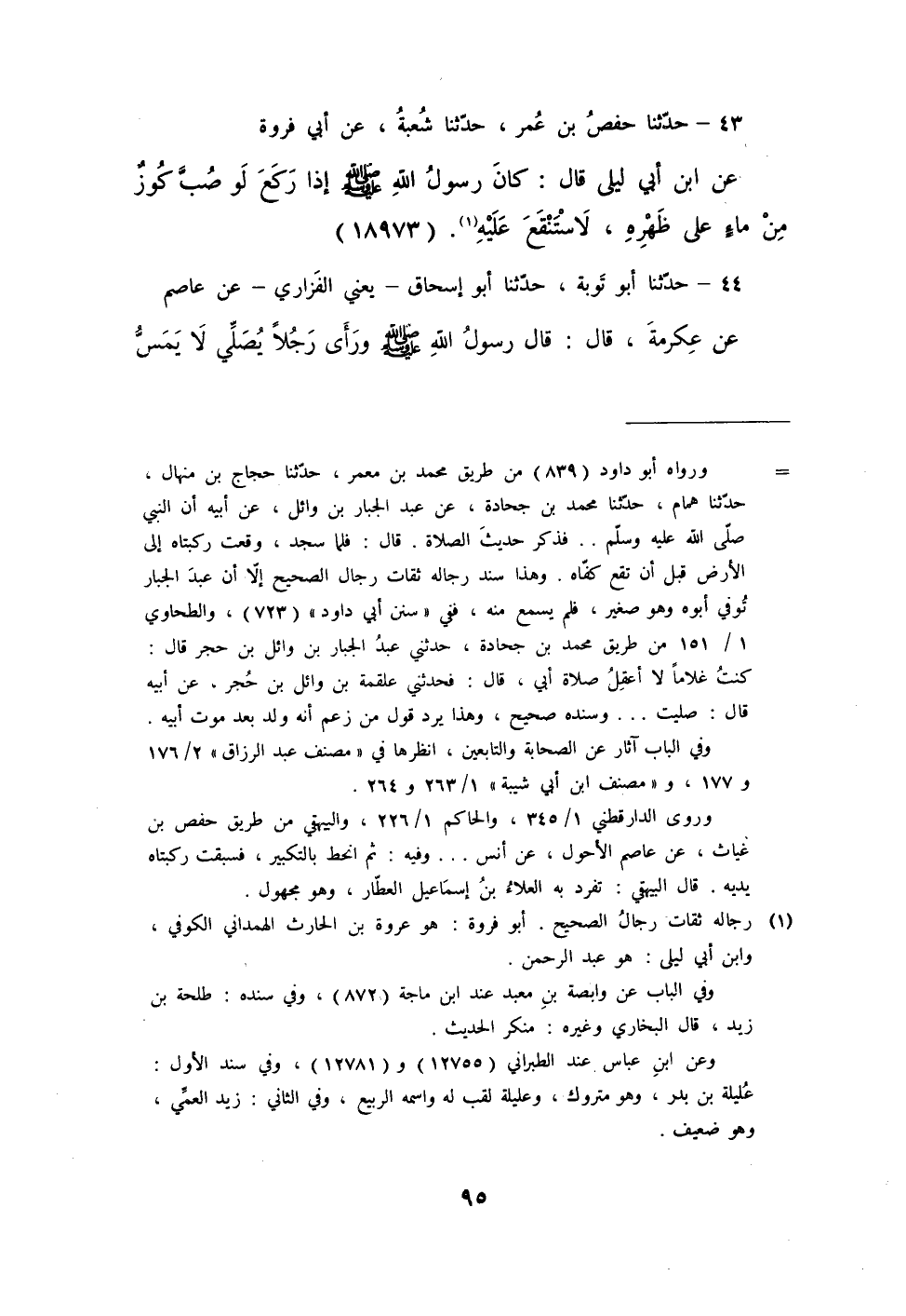 43 - حَدَّثَنَا حَفْصُ بْنُ عُمَرَ، حَدَّثَنَا شُعْبَةُ، عَنْ أَبِي فَرْوَةَ، عَنِ ابْنِ أَبِي لَيْلَى، قَالَ: «كَانَ رَسُولُ اللَّهِ صَلَّى اللهُ عَلَيْهِ وَسَلَّمَ §إِذَا رَكَعَ لَوْ صُبَّ كُوزٌ مِنْ مَاءٍ عَلَى ظَهْرِهِ لَاسْتَنْقَعَ عَلَيْهِ»