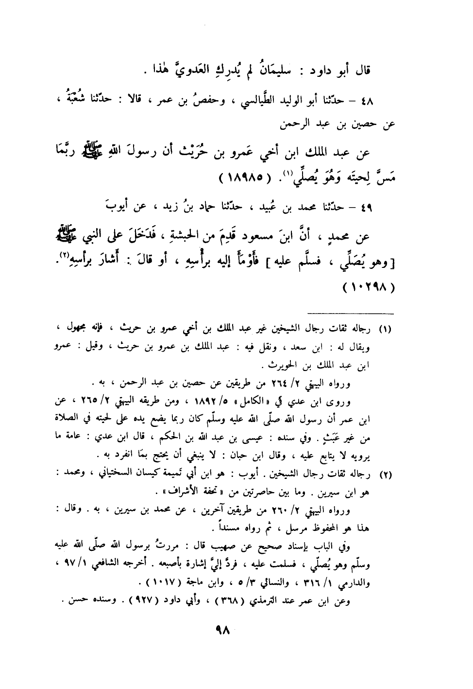 48 - حَدَّثَنَا أَبُو الْوَلِيدِ الطَّيَالِسِيُّ، وَحَفْصُ بْنُ عُمَرَ، قَالَا: حَدَّثَنَا شُعْبَةُ، عَنْ حُصَيْنِ بْنِ عَبْدِ الرَّحْمَنِ، عَنْ عَبْدِ الْمَلِكِ ابْنِ أَخِي عَمْرِو بْنِ حُرَيْثٍ «أَنَّ رَسُولَ اللَّهِ صَلَّى اللهُ عَلَيْهِ وَسَلَّمَ» §رُبَّمَا مَسَّ لِحْيَتَهُ وَهُوَ يُصَلِّي "