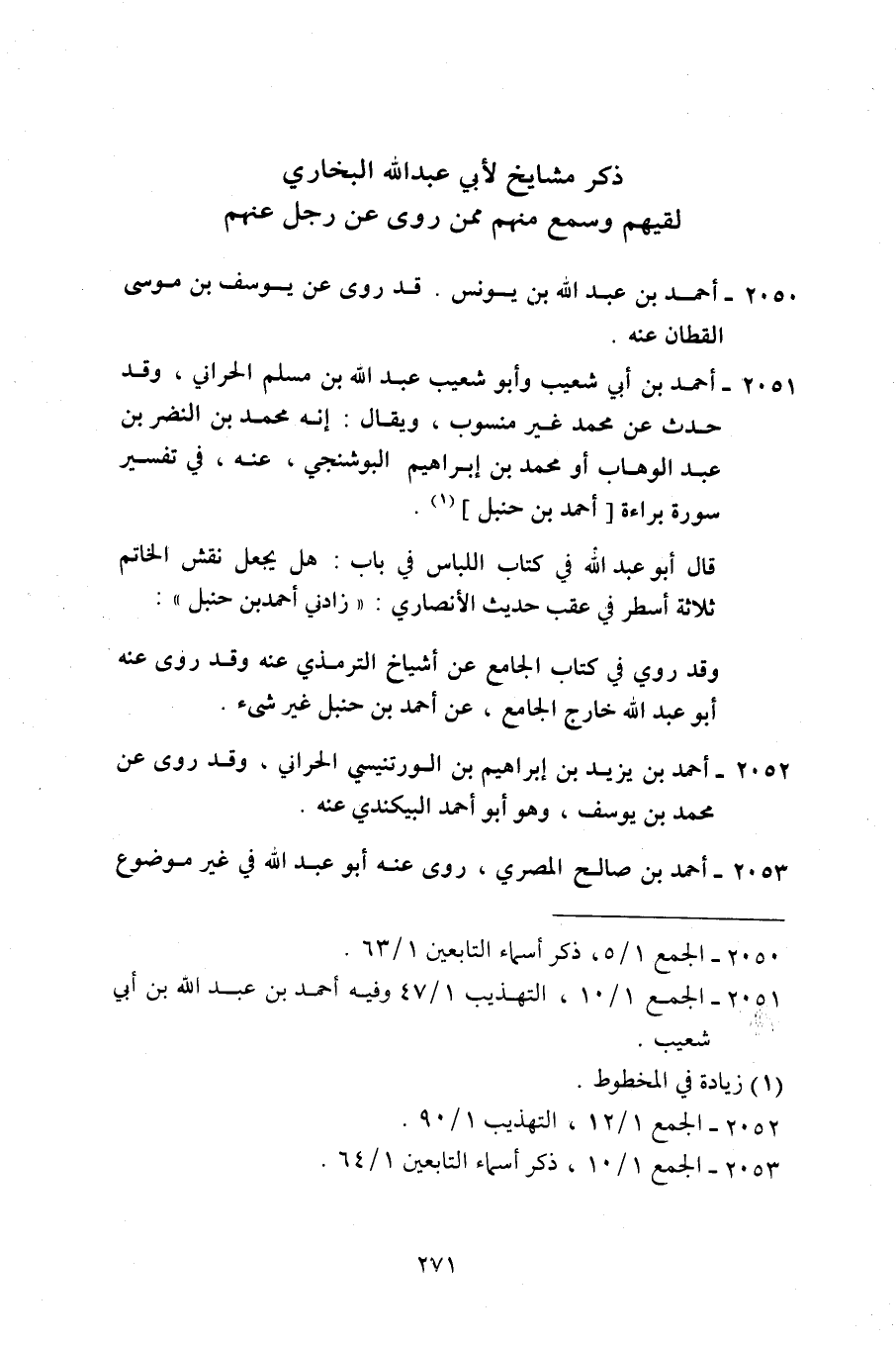 2051 - أَحْمد بن أبي شُعَيْب وَأَبُو شُعَيْب عبد الله بن مُسلم الْحَرَّانِي وَقد حدث عَن مُحَمَّد غير مَنْسُوب وَيُقَال إِنَّه مُحَمَّد بن النَّضر بن عبد الْوَهَّاب أَو مُحَمَّد بن إِبْرَاهِيم البوشنجي عَنهُ فِي تَفْسِير سُورَة بَرَاءَة أَحْمد بن حَنْبَل