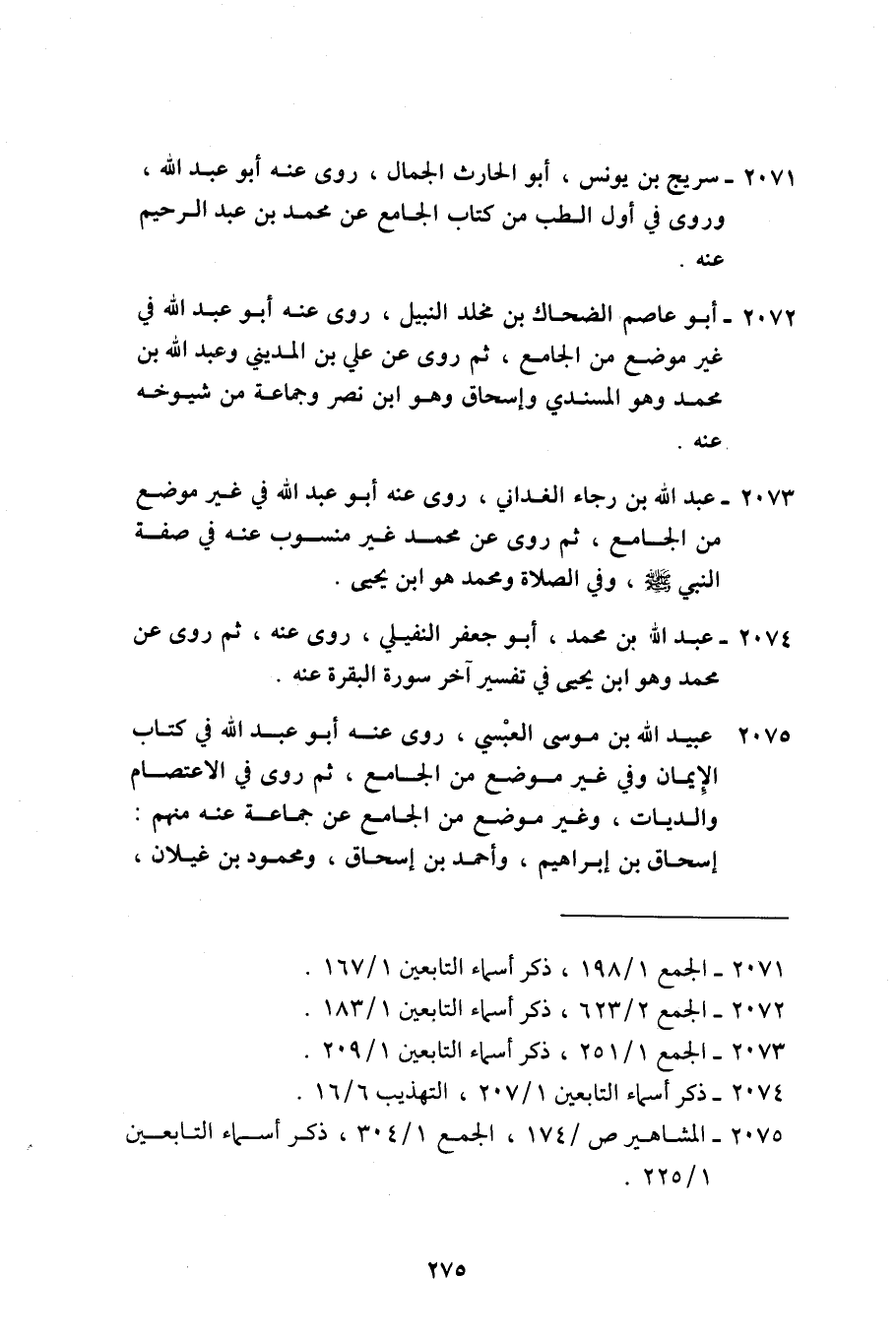 2075 - عبيد الله بن مُوسَى الْعَبْسِي روى عَنهُ أَبُو عبد الله فِي كتاب الْإِيمَان وَفِي غير مَوضِع من الْجَامِع ثمَّ روى فِي الِاعْتِصَام والديات وَغير مَوضِع من الْجَامِع عَن جمَاعَة عَنهُ مِنْهُم إِسْحَاق بن إِبْرَاهِيم وَأحمد بن إِسْحَاق ومحمود بن غيلَان