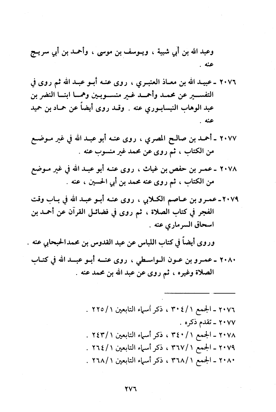 2076 - عبيد الله بن معَاذ الْعَنْبَري روى عَنهُ أَبُو عبد الله ثمَّ روى فِي التَّفْسِير عَن مُحَمَّد وَأحمد غير منسوبين وهما ابْنا النَّضر بن عبد الْوَهَّاب النَّيْسَابُورِي عَنهُ وَقد روى أَيْضا عَن حَمَّاد بن حميد عَنهُ