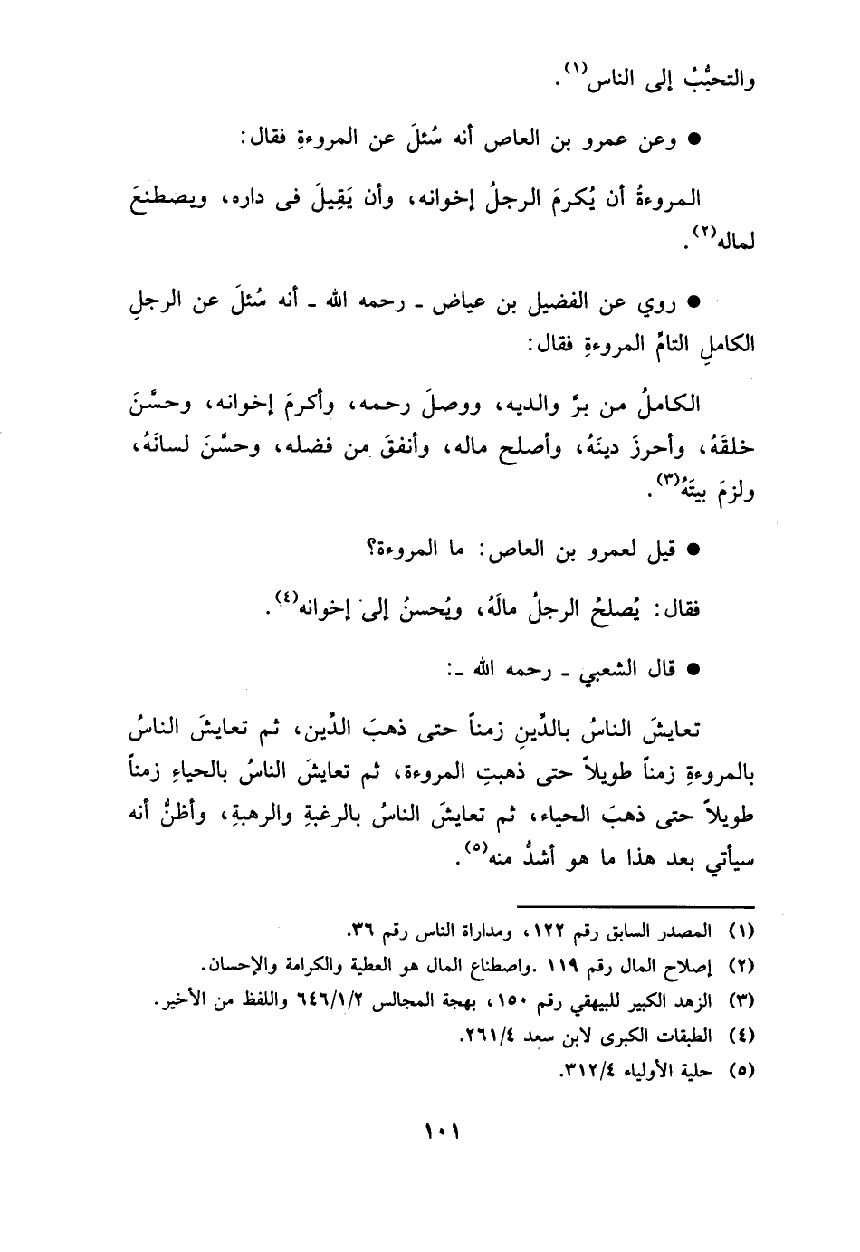 . رُوِيَ عَن الفضيل بن عِيَاض - رَحْمَة الله - انة سُئِلَ عَن الرجل الْكَامِل من بر وَالدية، وَوصل مالة، وانفق من فضلَة، وَحسن لسانة، وَلُزُوم بيتة.