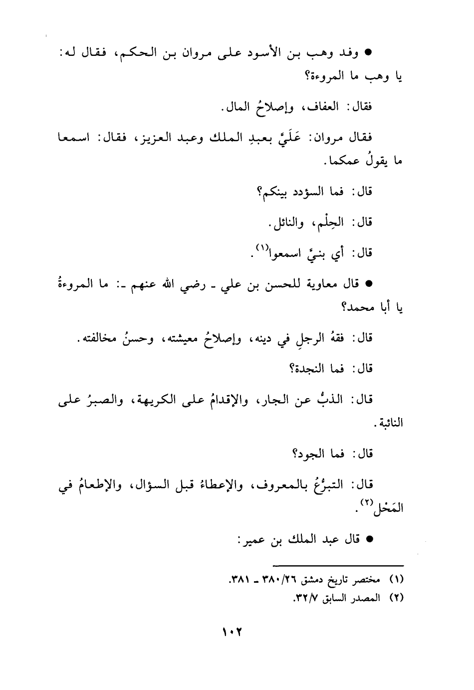 وَفد وهب بن الاسود عَليّ مَرْوَان بن الحكم ن فَقَالَ لَهُ: يَا وَهْبُ مَا الْمُرُوءَة؟