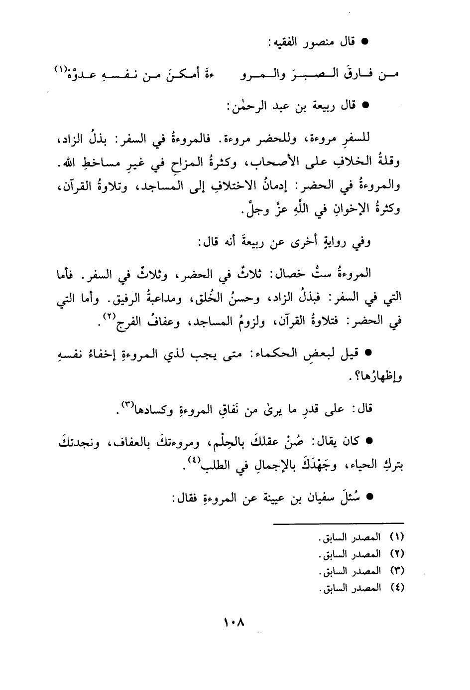 . سُئِلَ سُفْيَان بن عُيَيْنَة عَن الْمُرُوءَة فَقَالَ: