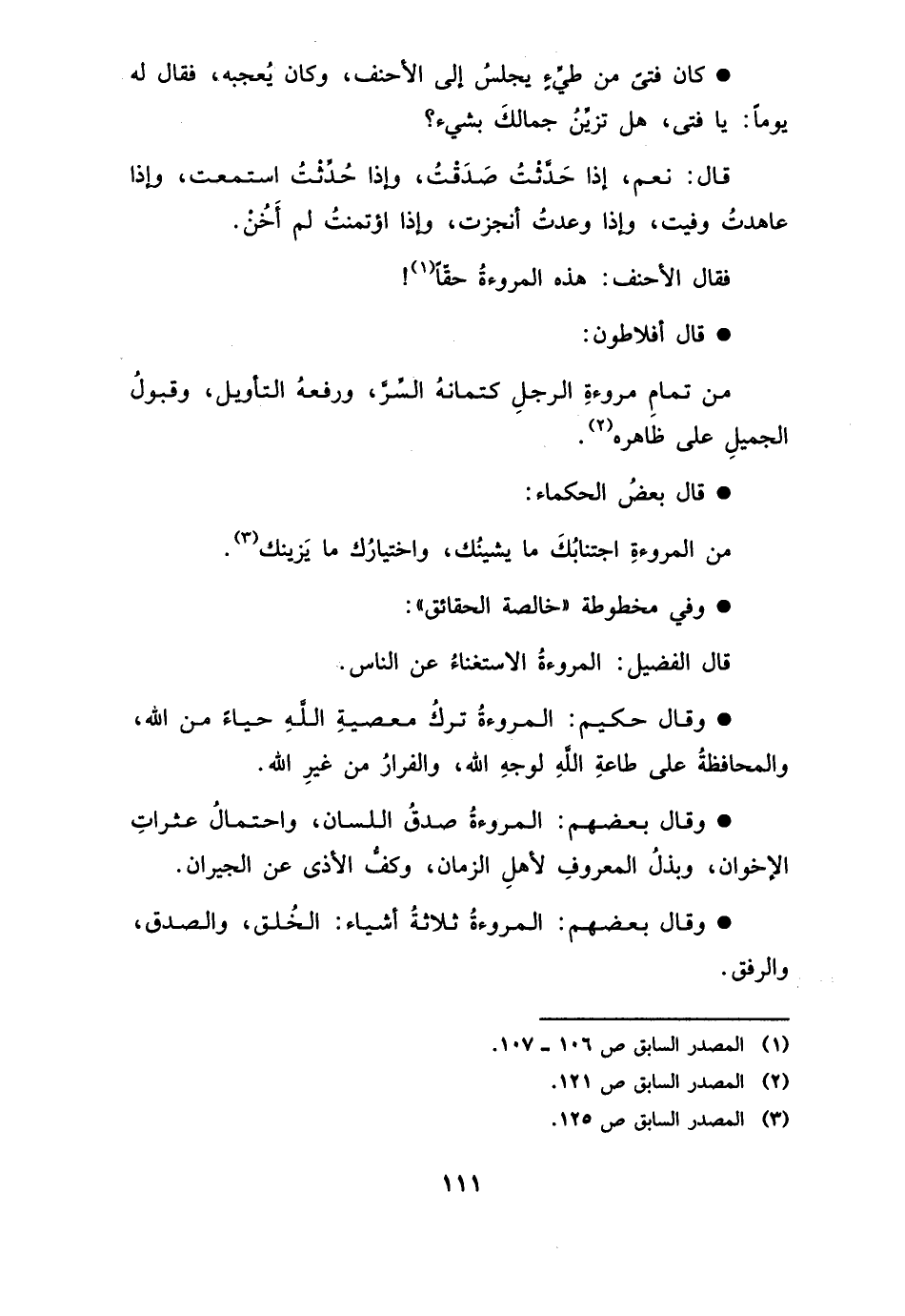 . وَقَالَ بَعضهم: الْمُرُوءَة ثَلَاثَة اشياء: الْخلق، الصدْق، والرفق.