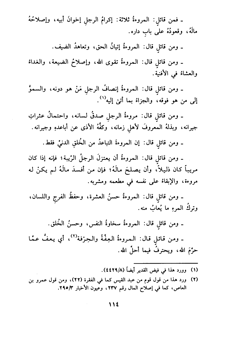 فَمن قَائِل: الْمُرُوءَة ثَلَاثَة إكرام الرجل اخوان ابيه واصلاحه مالة وقعودة على دارة وَمن قَائِل قَالَ الْمُرُوءَة اتيان الْحق وتعاهد الضَّيْف وَمن قَائِل قَالَ الْمُرُوءَة تقوى واصلاح الضَّيْعَة والغداء والْعشَاء فِي الافنية وَمن الْقَائِل قَالَ الْمُرُوءَة انصاف الرجل من هُوَ دونه والسمو الى من هُوَ فوقة والْجَزَاء بِمَا اتى اليه وَمن الْقَائِل قَالَ مُرُوءَة الرجل صدق لِسَانه وَاحْتِمَال عثرات جِيرَانه وبذلة الْمَعْرُوف لاهل زَمَانه وكفة الاذى عَن اباعدة وجيرانه وَمن قَائِل قَالَ ان الْمُرُوءَة التباعد من الْخلق والدنى فَقَط وَمن الْقَائِل قَالَ الْمُرُوءَة ان يعتزل الرجل الرِّيبَة فَإِنَّهُ إِذَا كَانَ مُرِيبًا كَانَ ذليلا وان يصلح مَاله فان من أَفْسَدَ مَالَهُ لَمْ يَكُنْ لَهُ مُرُوءَة والابقاء عَلَى نَفْسِهِ فِي مَطْعَمِهِ وَمَشْرَبِهِ وَمن الْقَائِل قَالَ الْمُرُوءَة حسن الْعشْرَة وَحفظ الْفرج واللِّسَان وترك الْمَرْء مَا يعاب مِنْهُ وَمن الْقَائِل قَالَ الْمُرُوءَة سخاوة النَّفس وَحسن الْخلق وَمن الْقَائِل قَالَ الْمُرُوءَة العفه والحزفه أَي يعف حرم الله ويحترف فِيمَا احل الله