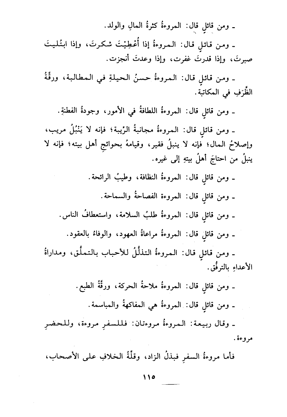 وَمن الْقَائِل قَالَ الْمُرُوءَة كَثْرَة المَال وَالْولد وَمن الْقَائِل قَالَ الْمُرُوءَة اذا اعطيت شكرت واذا ابْتليت صبرت واذا قدرت غفرت واذا وعدت انجزت وَمن الْقَائِل قَالَ الْمُرُوءَة حسن الْحِيلَة والْمُطَالبَة ورقة الظروف فِي الْمُكَاتبَة وَمن الْقَائِل قَالَ: الْمُرُوءَة للطاقة فِي الامور وجودة الفطنه من الْقَائِل قَالَ: الْمُرُوءَة مجانية والرِّيبَة فَإِن لَا ينبل مريب واصلاح المَال فَإِنَّهُ لَا ينبل فَقير وقيامه بحوائج اهل بَيته فَإِنَّهُ لَا ينبل من احْتَاجَ اهل بَيته الى غيرَة وَمن الْقَائِل قَالَ الْمُرُوءَة النَّظَافَة وَطيب الرَّائِحَة وَمن الْقَائِل قَالَ الْمُرُوءَة الفصاحة والسماحة وَمن الْقَائِل قَالَ الْمُرُوءَة طلب السَّلامَة واستعطاف النَّاس وَمن الْقَائِل قَالَ الْمُرُوءَة مُرَاعَاة العهود والْوَفَاء بِالْعُقُودِ وَمن الْقَائِل قَالَ الْمُرُوءَة التذليل للأحباب بالتعلق ومداراة الاعداء بالترفق وَمن الْقَائِل قَالَ الْمُرُوءَة ملاحة الْحَرَكَة ورقة الطَّبْع وَمن الْقَائِل قَالَ من المفاكهه والمباسمه وَقَالَ ربيعَة الْمُرُوءَة مروءتان فاللسفر مُرُوءَة وللحضر مُرُوءَة فَأَما مُرُوءَة السّفر فبذل الزَّاد وَقلة الخلاق\ف على الاصحاب