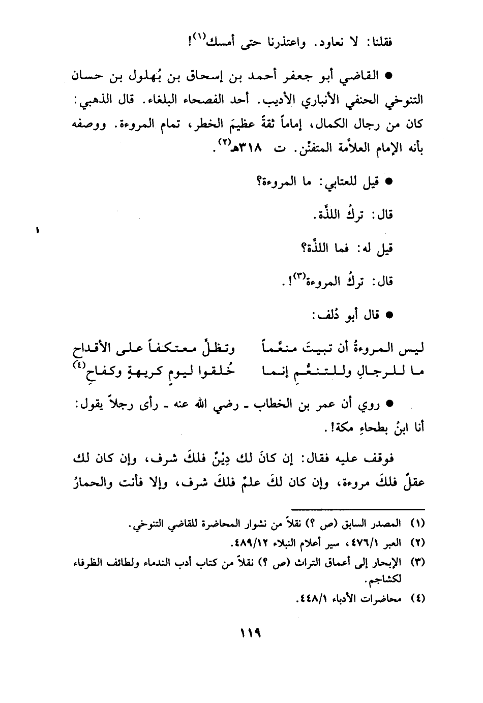 - قيل للعتابي مَا الْمُرُوءَة؟ قَالَ: ترك اللَّذَّة قيل فَمَا اللَّذَّة قَالَ ترك الْمُرُوءَة
