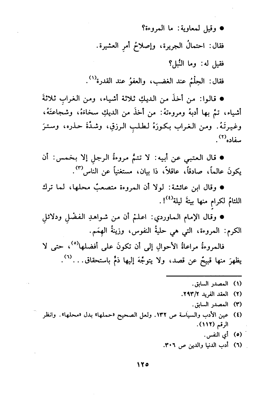 - وَقَالَ الْمَاوَرْدِيّ اعْلَم ان من شَوَاهِد الْفضل وَدَلَائِل الْكَرم الْمُرُوءَة الَّتِى هِيَ حلية النُّفُوس وزينه الهمم فالمروءة مُرَاعَاة الاحوال الى ان تكون على افضلها حَتَّى لَا يظْهر مِنْهُ قَبِيح عَن قصد وَلَا يتَوَجَّه اليها ذمّ بِاسْتِحْقَاق ...