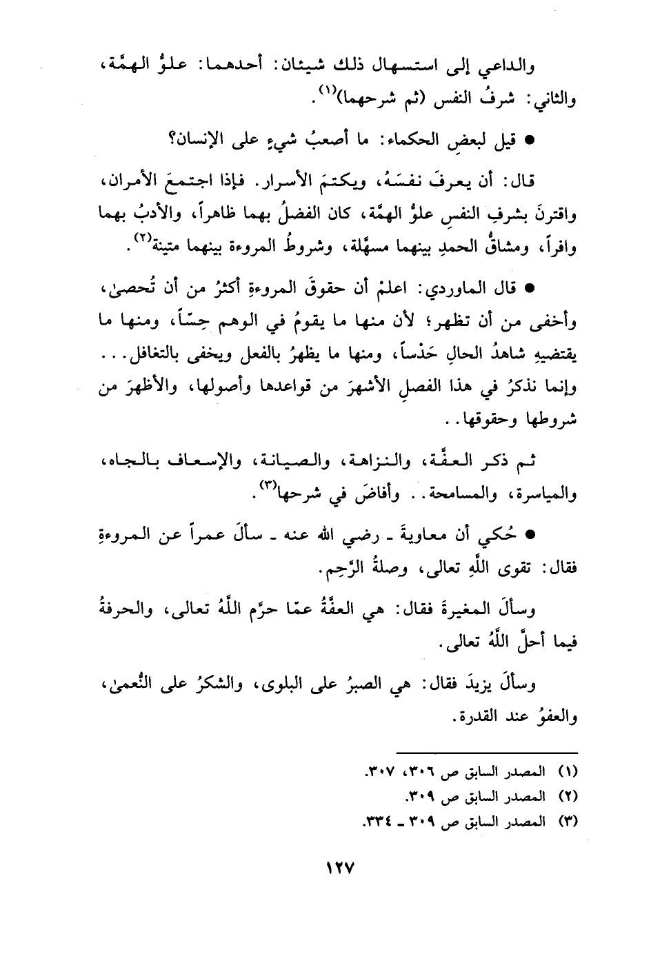 - قَالَ الْمَاوَرْدِيّ اعْلَم ان حُقُوق الْمُرُوءَة اكثر من ان تحصى واخفى من ان تظهر لَان مِنْهَا مَا يقوم فِي الْوَهم حسا وَمِنْهَا مَا يَقْتَضِيهِ شَاهد الْحَال حدسا وَمِنْهَا مَا يظْهر بِالْفِعْلِ وَيخْفى بالتغافل وانما نذْكر فِي هَذَا الْفَصْل الاشهر من قواعدها واصولها والاظهر من شُرُوطهَا وحقوقها ثمَّ ذكر الْعِفَّة والنزاهة والصيانة والاسعاف بالجاه والمياسرة والْمُسَامحَة وافاض فِي شرحها