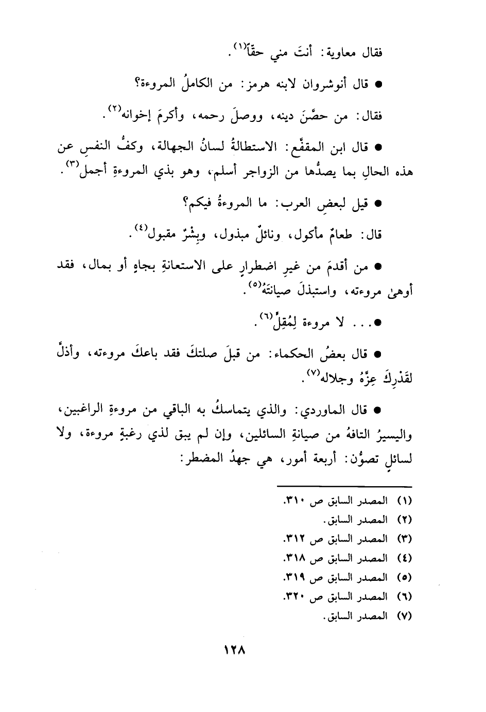 - قَالَ انوشروان لِابْنِهِ هُرْمُز من الْكَامِل الْمُرُوءَة فَقَالَ من حصن دينه وَوصل رَحْمَة واكرم أخوانة
