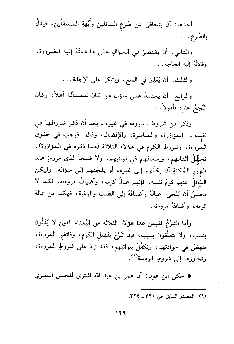 وَذكر من شُرُوط الْمُرُوءَة فِي غَيره -بعد أَن ذكر شُرُوطهَا فِي نَفسه المؤازرة، والمياسرة، والإفضال، وَقَالَ فَيجب فِي حُقُوق الْمُرُوءَة، وشروط الْكَرم فِي هَؤُلَاءِ الثَّلَاثَة (مِمَّا ذكره فِي المؤازرة) تحميل اثقالهم، واسعافهم فِي نوائبهم، وَلَا فسحة لذِي مُرُوءَة عِنْد ظُهُور المكنة أَن يكلهم لإلى غَيره، أَو يلجئهم إِلَى سُؤَاله. وَلِيكُم السَّائِل عَنْهُم كرم نَفسه، فَإِنَّهُم عِيَال كرمه، وأضياف مروءته، فَكَمَا لَا يحسن ان يلجئ عِيَاله وأضيافه إِلَى الطّلب وَالرَّغْبَة فَهَكَذَا من عاله كرمه، وأضافته مروءته. وَأما التَّبَرُّع ففيمن عدا هَؤُلَاءِ الثَّلَاثَة من الْبعدَاء الَّذين لَا يدلون بِنسَب، وَلَا يتعلقون بِسَبَب، فَإِن تبرع بِفضل الْكَرم، وفائض الْمُرُوءَة، فَنَهَضَ فِي حوادثهم، وتكفل فِي نوائبهم، فقد زَاد على شُرُوط الْمُرُوءَة وتجاوزها إِلَى شُرُوط الرياسة