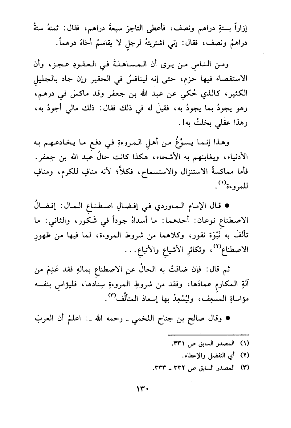 قَالَ الامام الْمَاوَرْدِيّ فِي الافضال اصطناع المَال افضال الاصطناع نَوْعَانِ احدهما مَا اسدة جودا فِي شكور والثَّانِي مَا تألف بِهِ نبوة نفور وَكِلَاهُمَا من شورط الْمُرُوءَة لما فِيهَا من ظُهُور والاصطناع وتكاثر الاشباع والِاتِّبَاع ثمَّ قَالَ فَأن ضَاقَتْ بِهِ الْحَال والاصطناع بِمَالِه فقد عدم من اله المكارم وعمادها وفقد من شُرُوط الْمُرُوءَة سنادها فليؤاس بنفسة مؤاسات المسعف وليسعد بهَا اسعاد المتألف