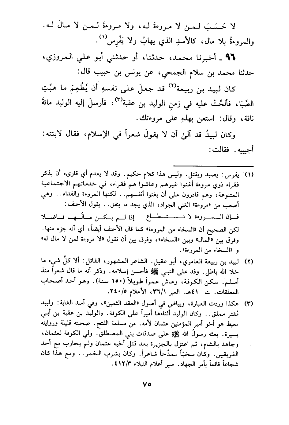 كَانَ لَبِيدُ بْنُ رَبِيعَةَ قَدْ جَعَلَ عَلَى نَفْسِهِ أَنْ يُطْعِمَ مَا هَبَّتِ الصَّبَا، فَأَلَحَّتْ عَلَيْهِ فِي زَمَنِ الْوَلِيدِ بْنِ عُقْبَةَ، فَأَرْسَلَ إِلَيْهِ الْوَلِيدُ مِائَةَ نَاقَةٍ وَقَالَ: اسْتَعِنْ بِهَذِهِ عَلَى مُرُوءَتِكَ.