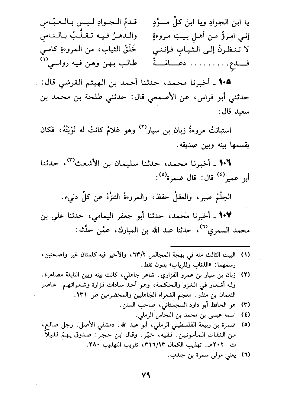 105- أَخْبَرَنَا مُحَمَّدٌ، حَدَّثَنَا أَحْمَدُ بْنُ الْهَيْثَمِ الْقُرَشِيُّ قَالَ: حَدَّثَنِي أَبُو فراس، عَن الاصمعي قَالَ: حديني طَلْحَةُ بْنُ مُحَمَّدِ بْنِ سَعِيدٍ قَالَ: