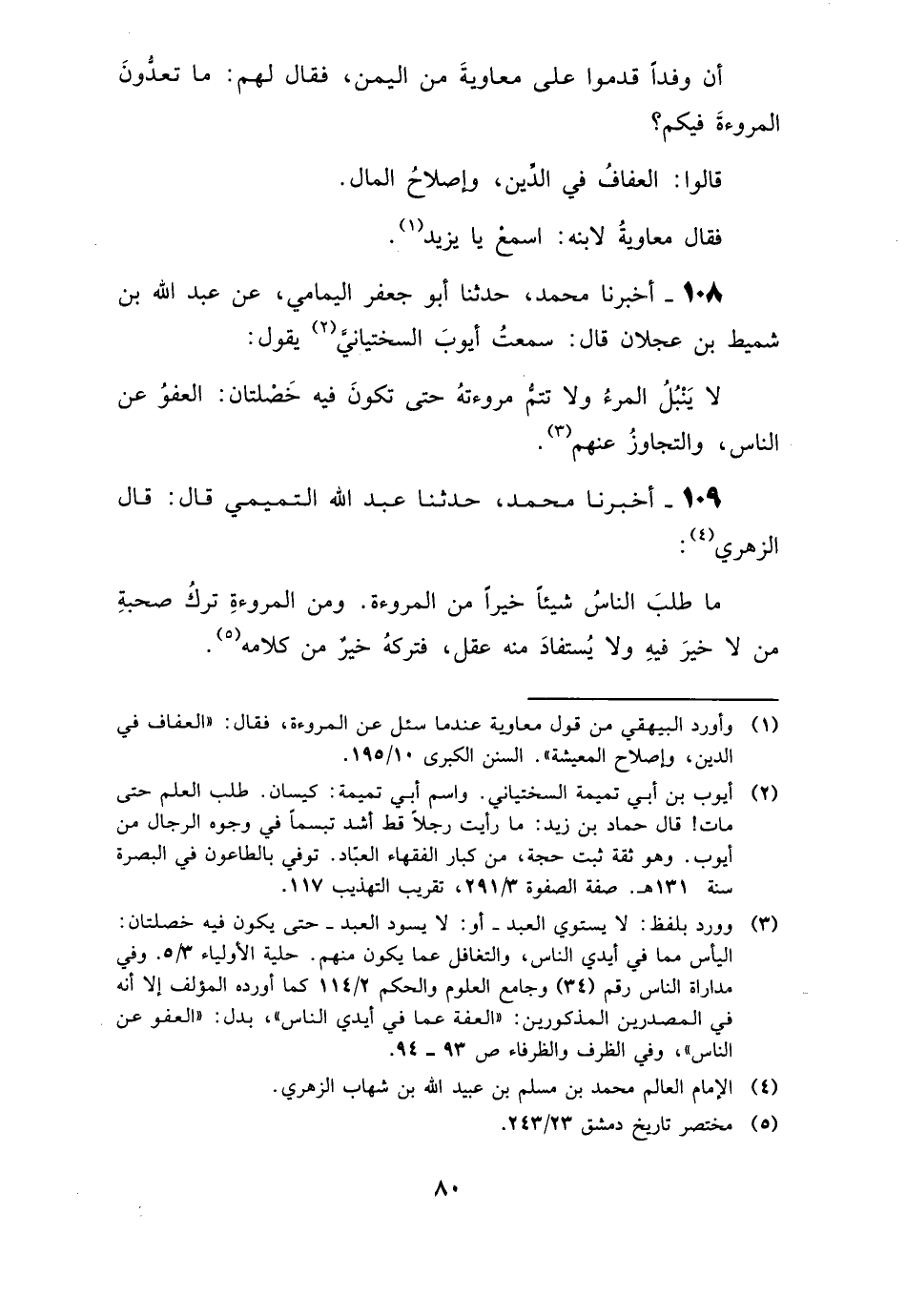 أن وَفد قدمرا عَلَى مُعَاوِيَةَ مِنَ الْيَمَنِ، فَقَالَ لَهُمْ: مَا تَعُدُّونَ الْمُرُوءَةَ فِيكُمْ؟
