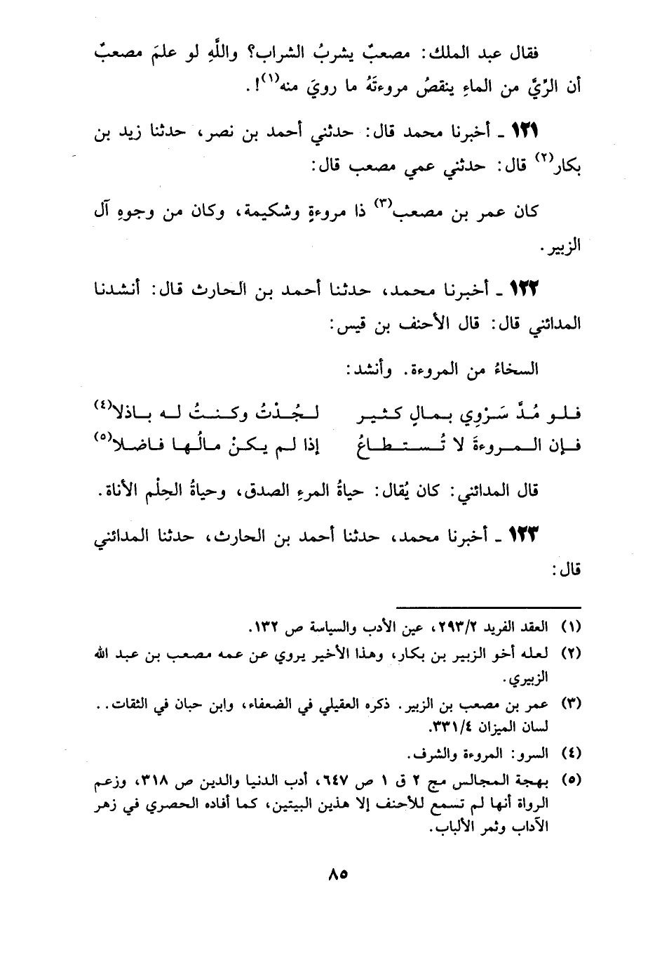 فَقَالَ عَبْدُ الْمَلِكِ: مُصْعَبٌ يَشْرَبُ الشَّرَابَ؟ وَاللَّهِ لَوْ عَلِمَ مُصَعْبٌ أَنَّ الرِّيَّ مِنَ الْمَاءِ يُنْقِصُ مُرُوءَتَهُ مَا رُوِيَ مِنْهُ!.