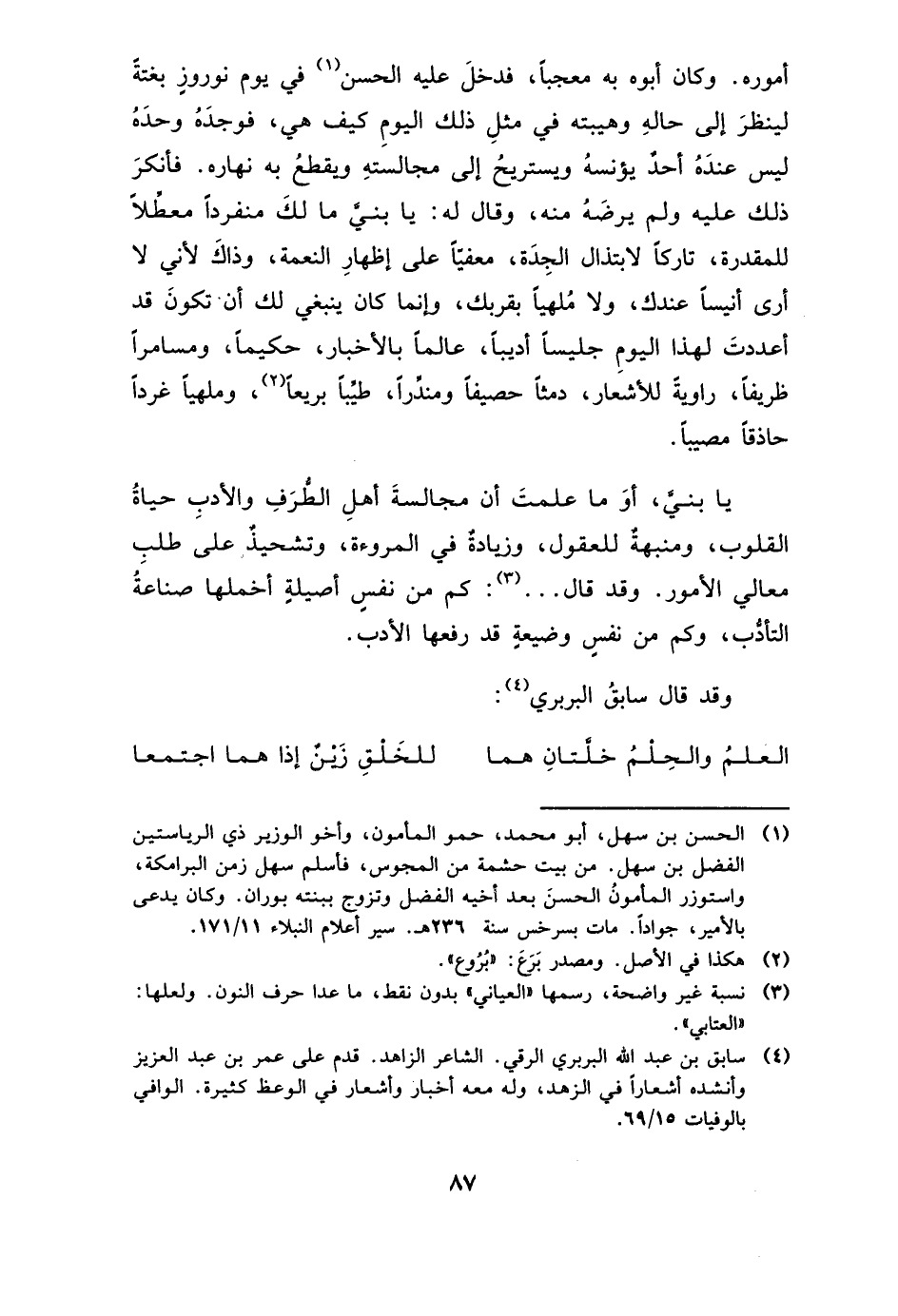 امروة. وَكَانَ أَبُوهُ بِهِ مُعْجَبًا، فَدَخَلَ عَلَيْهِ الْحَسَنُ فِي يَوْمِ نَوْرُوزٍ بَغْتَة لينظرالي حَالَة وهيبة فِي مِثْلِ ذَلِكَ الْيَوْمِ كَيْفَ هِيَ، فَوَجَدَهُ وَحْدَهُ لَيْسَ عِنْدَهُ اُحْدُ يونسة وَيَسْتَرِيحُ إِلَى مُجَالَسَتِهِ وَيَقْطَعُ بِهِ نهارة. فانكرة ذَلِكَ عَلَيْهِ وَلَمْ يَرْضَهُ مِنْهُ، وَقَالَ لَة: يَا بني مَالك مُنْفَرِدًا مُعَطِّلًا لِلْمَقْدِرَةِ، تَارِكًا لِابْتِذَالِ الْجِدَةِ، مَعْفِيًّا عَلَى إِظْهَارِ النِّعْمَةِ، وَذَلِكَ لاني لَا اري تنيسا عِنْدَكَ، وَلَا مُلْهِيًّا بِقُرْبِكَ، وَإِنَّمَا كَانَ يَنْبَغِي لَكَ أَنْ تَكُونَ قَدْ أَعْدَدْتَ لِهَذَا الْيَوْمِ جَلِيسًا اديبا، عَالما بِالأَخْبَارِ، حَكِيمًا، وَمُسَامِرًا ظَرِيفًا، رَاوِيَةً للاشعار، دمثا حصيفا ومنذرا، طَيِّبًا بَرِيعًا، وَمُلْهِيًّا غَرِدًا حَاذِقًا مُصِيبًا.