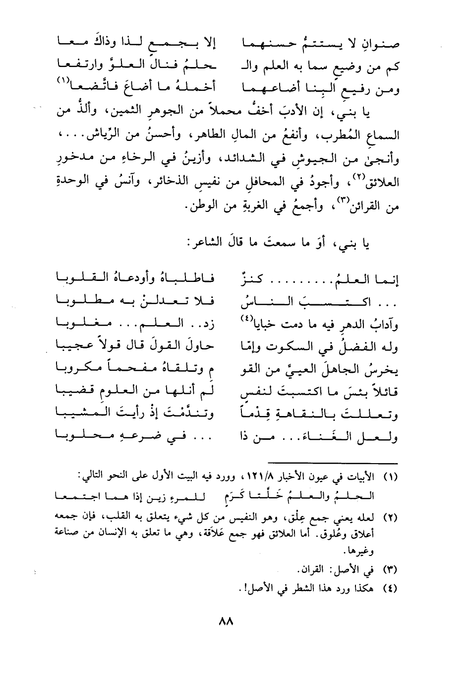 يَا بُنَيَّ، إِنَّ الأَدَبَ أَخَفُّ مَحْمَلًا مِنَ الْجَوْهَرِ الثَّمِينِ، وَأَلَذُّ مِنَ السَّمَاعِ الْمُطْرِبِ، وَأَنْفَعُ مِنَ الْمَالِ الطَّاهِرِ، وَأَحْسَنُ مِنَ الرِّيَاشِ ... ، وَأَنْجَى مِنَ الْجُيُوشِ فِي الشَّدَائِدِ، وَأَزْيَنُ فِي الرَّخَاءِ مِنْ مَدْخُورِ الْعَلائِقِ، وَأَجْوَدُ فِي الْمَحَافِلِ مِنْ نَفِيسِ الذَّخَائِرِ، وَآنَسُ فِي الْوِحْدَةِ مِنَ الْقَرَائِنِ، وَأَجْمَعُ فِي الْغُرْبَةِ مِنَ الْوَطَنِ.