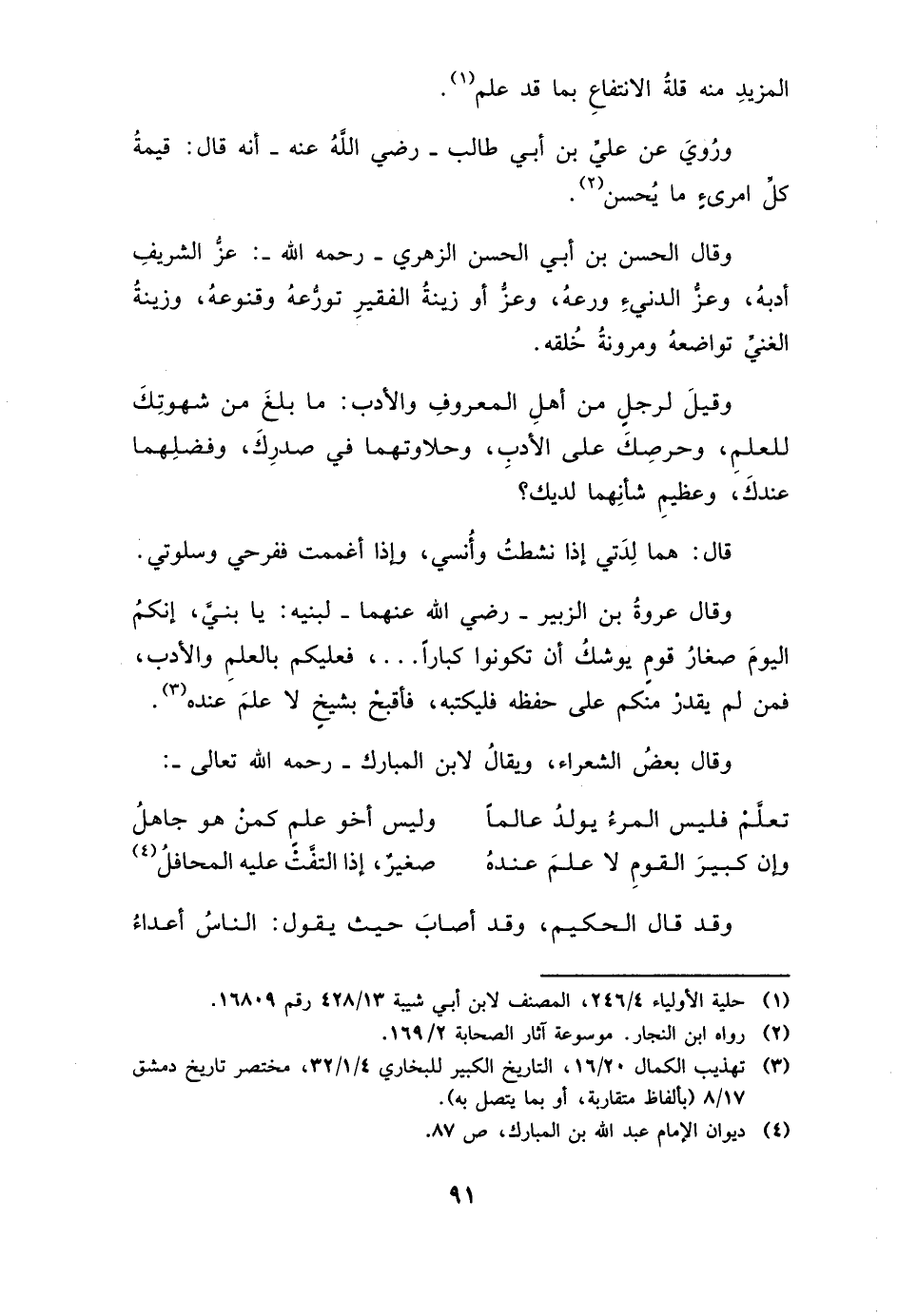 وَقَالَ عُرْوَةُ بْنُ الزُّبَيْرِ -رَضِيَ اللَّهُ عَنْهُمَا - لبنية: يَا بني، إِنَّكُمُ الْيَوْمَ صِغَارُ قَوْمٍ يُوشِكُ أَنْ تَكُونُوا كِبَارًا ... ، فَعَلَيْكُمْ بِالْعِلْمِ وَالْأَدَبِ، فَمَنْ لَمْ يَقْدِرْ مِنْكُمْ عَلَى حِفْظِهِ فَلْيَكْتُبْهُ، فَأَقْبِحْ بِشَيْخٍ لَا عِلْمَ عِنْدَهُ.