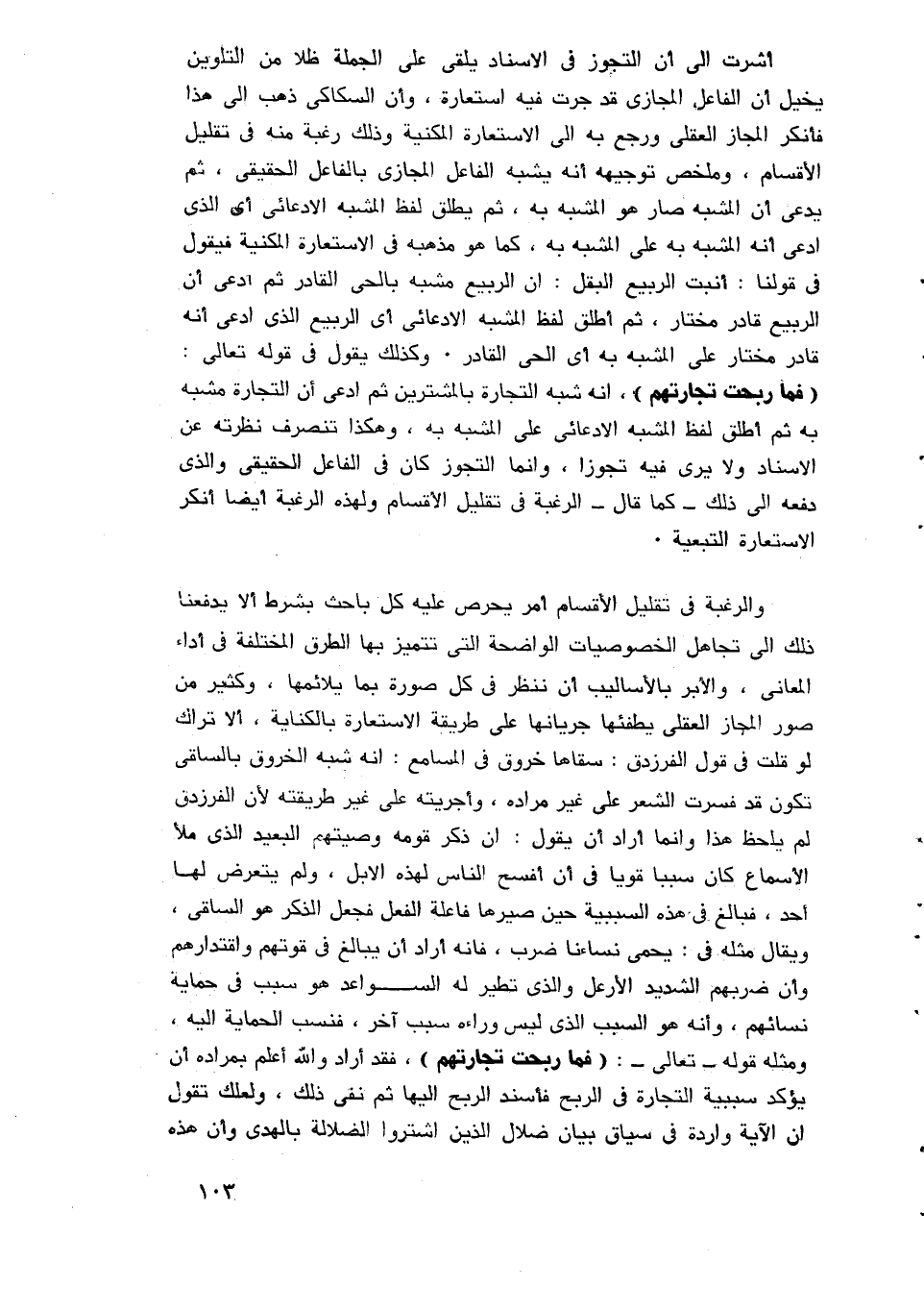 ولما كانت مسألة خلق الأفعال من المسائل التي شغلت المسلمين نبه أهل هذه الصناعة إلى أننا، وإن كنا نعتقد معتقد أهل السنة، وأن الأفعال كلها عند التحليل الباحث عن مصدرها، مخلوقة لله إلا أننا نقول: إن زيدا هو الفاعل الحقيقي في قولنا رمي زيد؛ لأن الرمي معنى قائم بزيد، ووصف له، وله فيه كسب وتحصيل، وهذا يكفي ليكون الإسناد حقيقيًّا، فقولنا: إن خالق الأفعال كلها هو الله، وأنه سبحانه هو الفاعل الحقيقي لكل شيء لا يعني أن تكون كل الصور التي تستند فيها الأفعال لغيره سبحانه صورا مجازية، وهذا لو قلناه لكان ضربا من الهذيان، ولقادنا إلى كبيرة حين نسند أفعال القيام، والقعود والأكل والشرب وغيرهما مما يتنزه عنه جلاله.