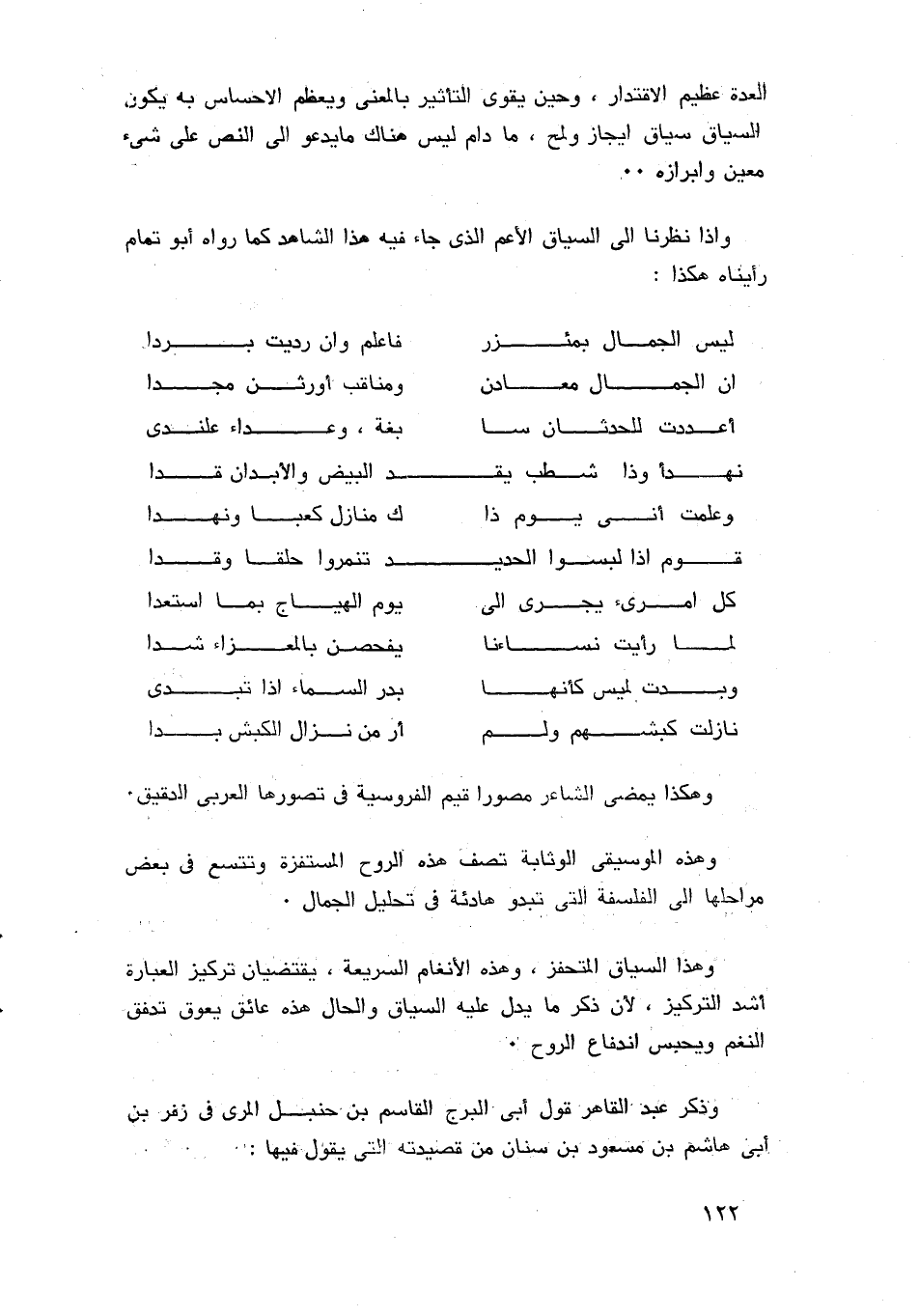 واختراط السيوف سلها وتهيؤها للنزال، والضرب الأرعل الشديد السريع والرجل الأرعل، الطياش الأحمق، يريد أن يقول: إنا إذا ابتدأ الشد نحمي نساءنا بضرب شديد وسريع، تطير له السواعد، ولكنه تصرف في التركيب تصرفا أخرج به صورة الكلام مخرجا غير الذي قلناه، وذلك بإسناد الحماية إلى الضرب، فقال: يحمي نساءنا ضرب، وقدم قوله: إذا اخترط السيوف على الفاعل، وأوقع هذا الشرط معترضا بين جزأي الجملة؛ لأنه أراد أن يبرز صعوبة ذلك الوقت الذي يحمي هذا الضرب الأرعل فيه النساء، وأنه وقت يصاب فيه غيرهم بالدهش والفجاءة.