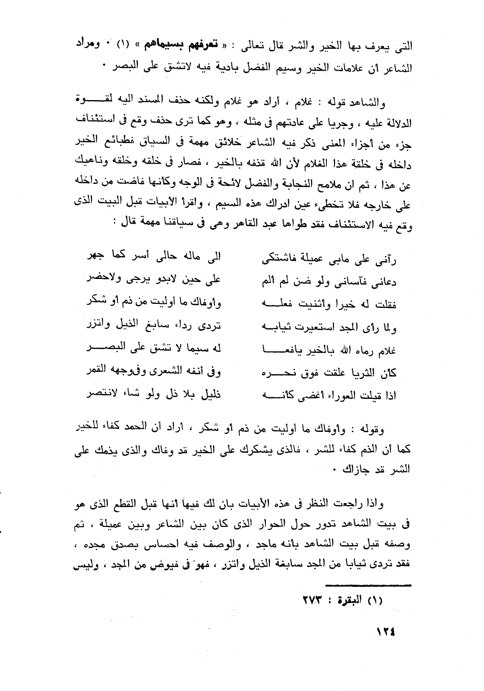 العجول: الناقة التي فقدت ولدها فهي واله، والبو: ولد الناقة، والمراد به هنا الجلد يحشى ثمامًا أو تبنا، فيقرب من أم الفصيل، فتعطف عليه فتدر، والآظآر: جمع ظئر وهي العاطفة على ولد غيرها لترضعه، وقالوا: ظأرني على الأمر، أي: أكرهني كأنه عطفه عليه ولواه، وقالوا: ظأرتهم الرماح على الصلح كأنها ترغمهم وتلويهم عليه، والمرزمة ذات الإرزام وهو الحنين وصوت تخرجه الناقة من حلقها لا تفتح به فما، وقالوا: لا أفعل ذلك ما أرزمت أم حائل، أي ما حنت عجول حال ولدها ... وشاهدنا قولها: "فإنما هي إقبال وإدبار"، فقد أسندت الإقبال والإدبار إلى الناقة عل طريقة قولنا: زيد عدل، وهذا تجوز في الإسناد، والإقبال، والإدبار كلاهما مستعمل في أصل معناه، وهذا الإسناد أفاد أن هذه الناقة حين ذكرت ولدها ارتاعت من شدة ما تجد، واشتدت بها الوجد وأخذت تقبل وتدبر، وكأنها لفرط إقبالها وإدبارها، صارت إقبالًا وإدبارًا، قال عبد القاهر: "لم ترد بالإقبال والإدبار غير معناها فتكون قد تجوزت في نفس الكلمة، وإنما تجوزت في أن جعلتها -لكثرة ما تقبل وتدبر، ولغلبة ذلك عليها واتصاله بها، وأنه لم يكن لها حال غيرها -كأنها تجسمت من الإقبال والإدبار"، والناقة هنا استحالت إقبالا وإدبارًا، هي هكذا في هذ الشعر.