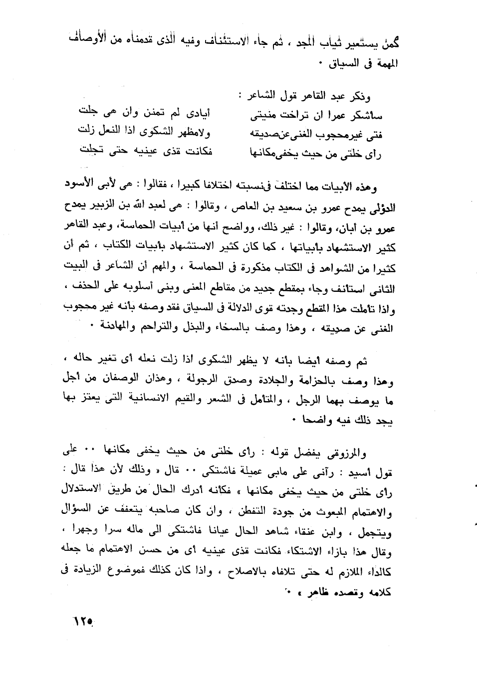 أنه في تقدير محذوف، وأن معناه الآن كالمعنى إذا قلت: بدت مثل القمر ومالت مثل خوط بان، وفاحت مثل عنبر، ورنت مثل غزال في أنا نخرج إلى الغثاثة، وإلى شيء يعزل البلاغة عن سلطانها، ويخفض من شأنها، ويصد أوجها من محاسنها، ويسد باب المعرفة بها وبلطائفها علينا"، ثم يؤكد رفض هذا ويحتم أخذ المعنى كما يعطيه هذا البناء الذي بني عليه الشعر.