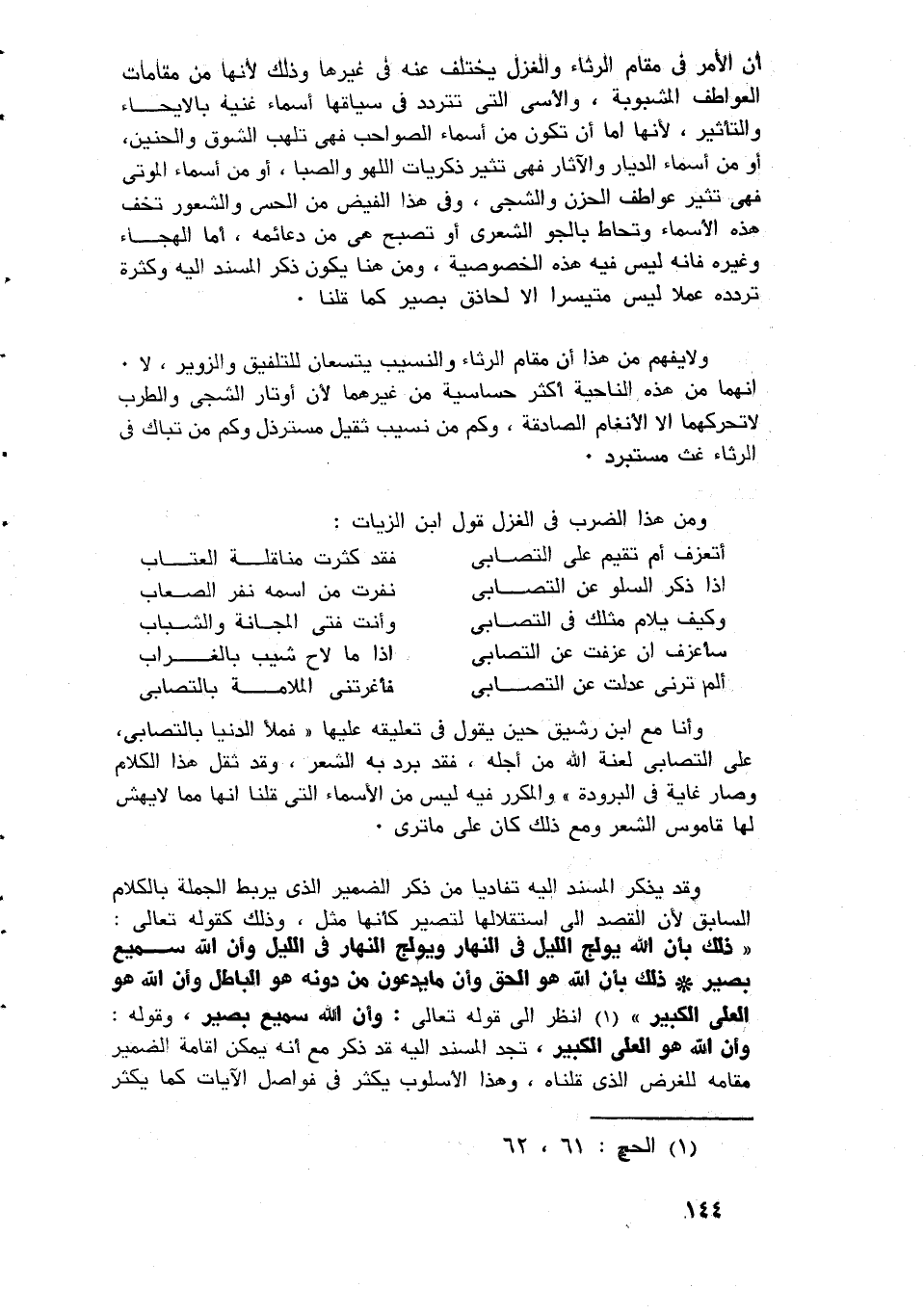 يلحظ هذا، وإنما أراد أن يقول: إن ذكر قومه وصيتهم البعيد الذي ملأ الأسماع كان سببا قويا في أن أفسح الناس لهذه الإبل، ولم يتعرض لها أحد، فبالغ في هذه السببية حين صيرها فاعلة الفعل، فجعل الذكر الذكر هو الساقي، ويقال مثله في: يحمي نساءنا ضرب، فإنه أراد أن يبالغ في قوتهم، واقتدارهم وأن ضربهم الشديد الأرعل، والذي تطير له السواعد هو سبب في حماية نسائهم، وأنه هو السبب الذي ليس وراءه سبب آخر، فنسب الحماية إليه، ومثله قوله - تعالى-: {فَمَا رَبِحَتْ تِجَارَتُهُمْ} ، فقد أراد والله أعلم بمراده أن يؤكد سببية التجارة في الربح، فأسند الربح إلبها ثم نفى ذلك، ولعلك تقول: إن الآية واردة في سياق بيان ضلال الذين اشتروا الضلالة بالهدى، وأن هذه التجارة لا ربح فيها، فكيف نقول: إن التجوز في الإسناد مشير إلى قوة سببية هذه التجارة في ربح أصحابها؟
