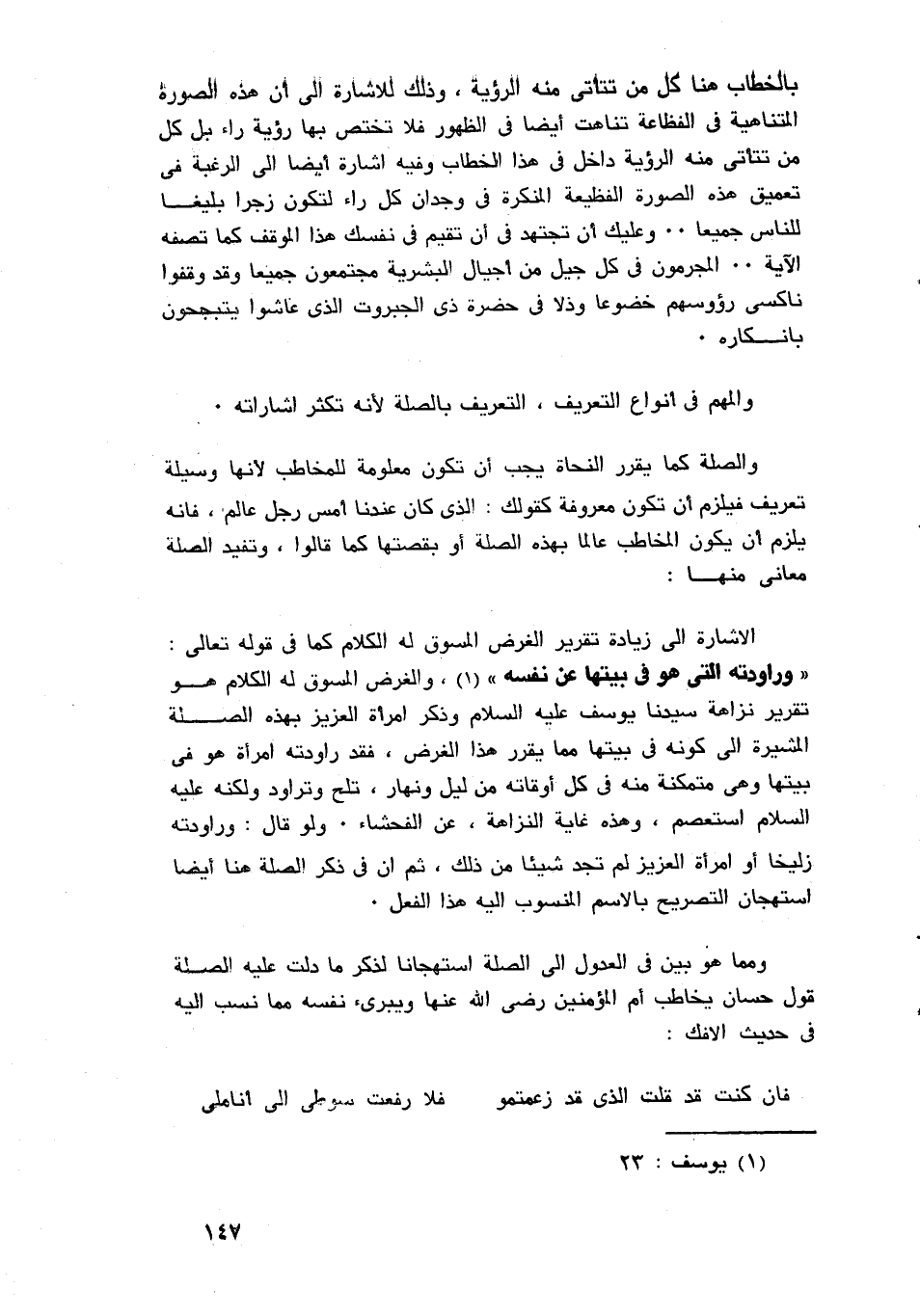 ويجب أن نذكر أننا لا نستطيع أن نفسر كل أسباب الحسن في العبارة؛ لأن ذلك لا يقدر عليه أحد، فالمزايا تتأبى على التعليل المستقصى، والشرح الكاشف، وهناك مكامن تكمن فيها أسباب الخلابة في العبارة، وتستتر في مطوايها آيات الحسن، ونؤخذ بها ولا نستطيع بيانها، وكأنها السحر المخبوء الذي يحسونه في البيان، وهذه آية من آيات الجمال في كل صورة، لا تستطيع أن تفسر كل ما يقع في نفسك حين تملأ عينيك، وقلبك بالنظر في وجه طفل واداع بريء، ولا تستطيع أن تشرح لنا مراجع الحسن، والخلابة التي تستهويك، وتسحرك في رشاقة ظبي غرير، وكل ذلك من باب واحد، وحين نتكلم في مراجع المزية إنما نصف ما يظهر لنا ونستطيع لمحة فيها، نحن ننبه فقط إلى ما تنبه إليه حسنا، والناس في ذلك متفاوتون، ويبقى بعد كل جهد أمور تدركها المعرفة، ولا تحيط بها الصفة، كما يقول أهل الذوق.