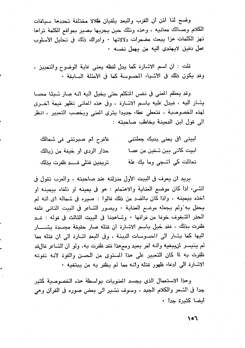 والنحاة والبلاغيون يذكرون هذا البيت في الحذف الشاذ والضرورة؛ لأنه ظلم الكلمة بحذف أكثر من حرف، ويمكن أن نقول: إن الحذف في كلمة المنازل التي يتحدث عن دروسها، وتغيير القدم لمعالمها مناسب؛ لأنها بقيت آثارًا، وكأن الحذف فيه إشارة إلى المضمون الذي يريد بيانه، وهو أن المنازل بقايا لا يستدل عليها إلا بالقرائن والشواهد، فالحذف في اللفظ وثيق الصلة بالمعنى.