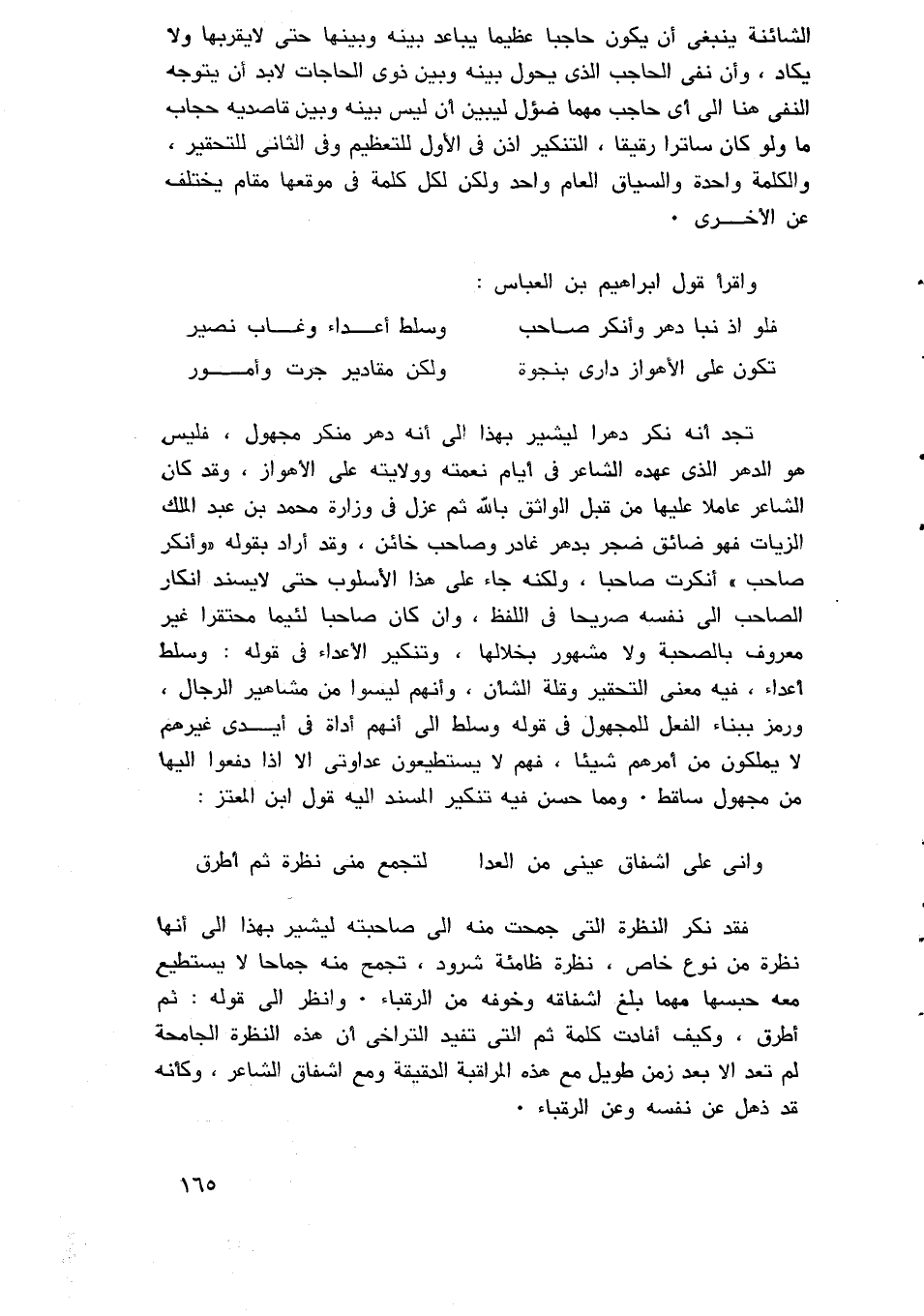 يذكر شجاعته، وأنه نازل كعبا وهي قبيلة من ولد الحارث من مذحج، ونهدا وهي قبيلة من قضاعة، ثم قطع الحديث، وقال قوم وأراد: هم قوم، والحلق المراد بها حلق الدروع، والقد اليلب وهو شبه درع يلبس في الحرب، والمراد بقوله: تنمروا أنهم تشبهوا بالنمور في أفعالهم في الحرب، أو أن الحلق والقد تختلف ألوانها اختلاف لون النمر، والمرزوقي يرى أن الأول أجود، والحذف جاء في مقطع جديد من مقاطع المعنى، فإنه ذكر في البيت الأول كعبا، ونهدا وهكذا من غير إشارة إلى ما هم عليه من العدة والقوة، ثم استأنف حديثا آخر أو جزءا جديدا من المعنى، فذكر عدتهم وبنى هذا الاستئناف على الحذف لقوة الدلالة عليه؛ ولأنه مناسب -كما أشرنا- إلى قوة الانفعال بهذا الجزء من المعنى، فإن الإحساس بالفروسية يعظم حين تكون الملاقاة مع عدو موفور العدة عظيم الاقتدار، وحين يقوى التأثير بالمعنى، ويعظم الإحساس به يكون السياق سياق إيجاز ولمح، ما دام ليس هناك ما يدعو إلى النص على شيء معين وإبرازه ...